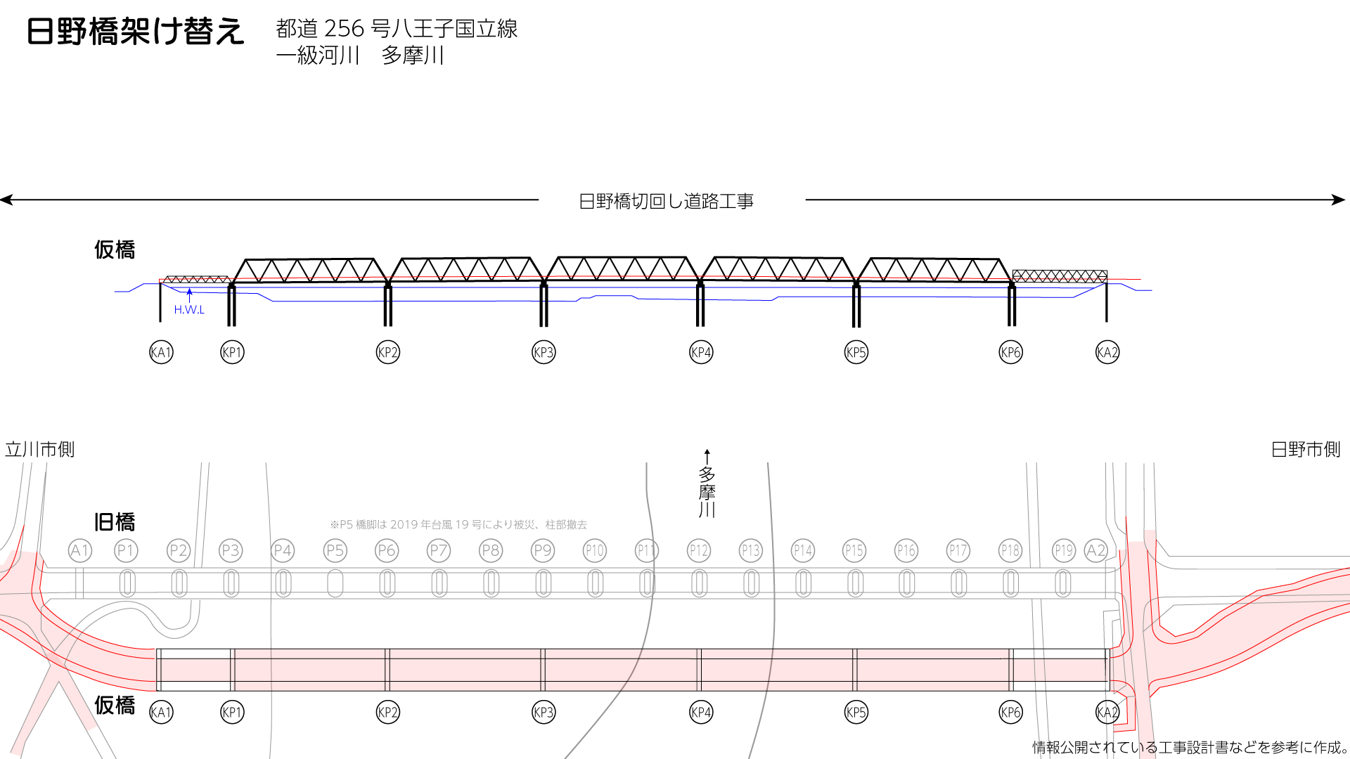 多摩川に架かる日野橋では架け替え事業が行われます。