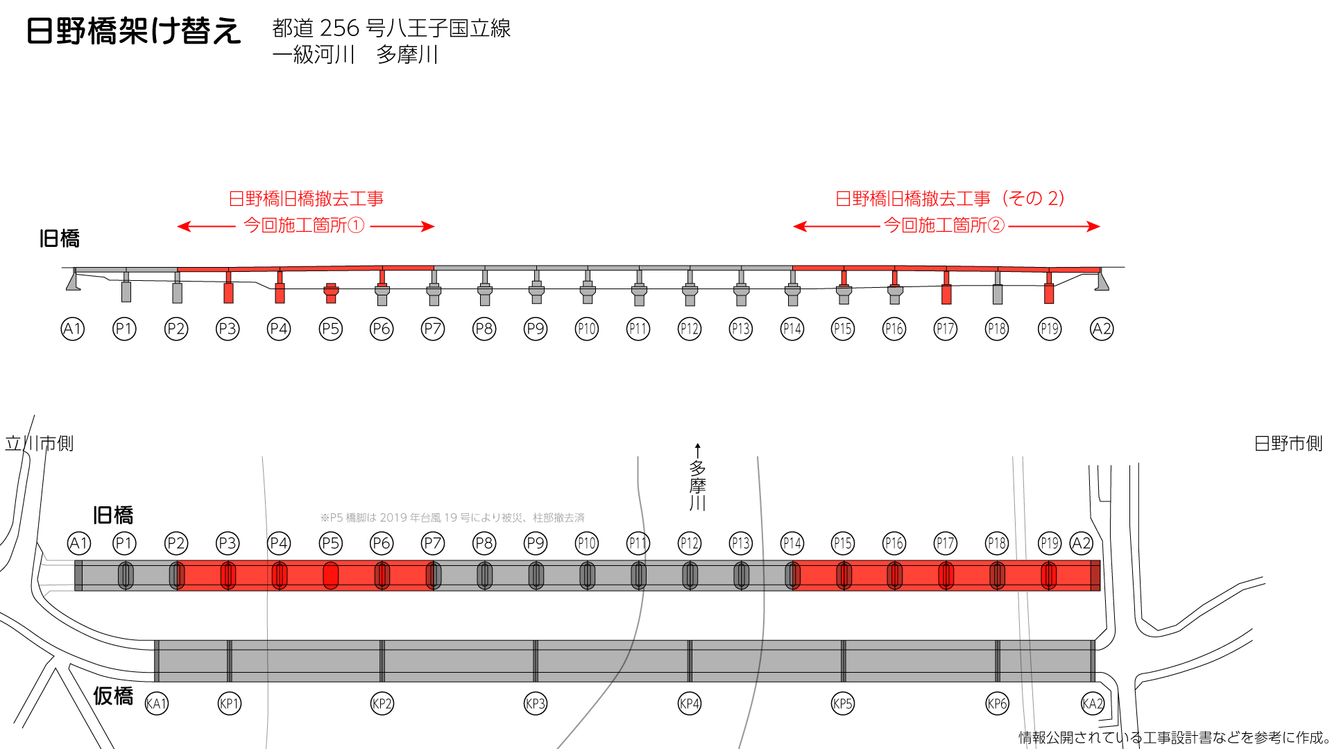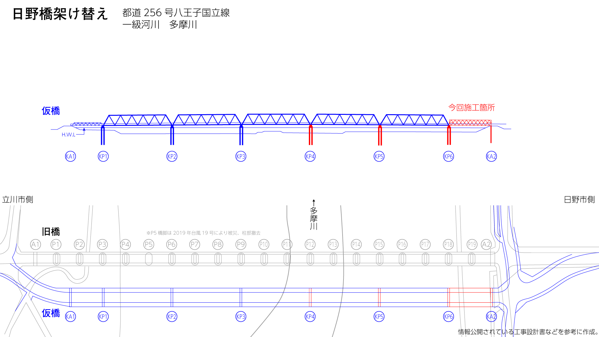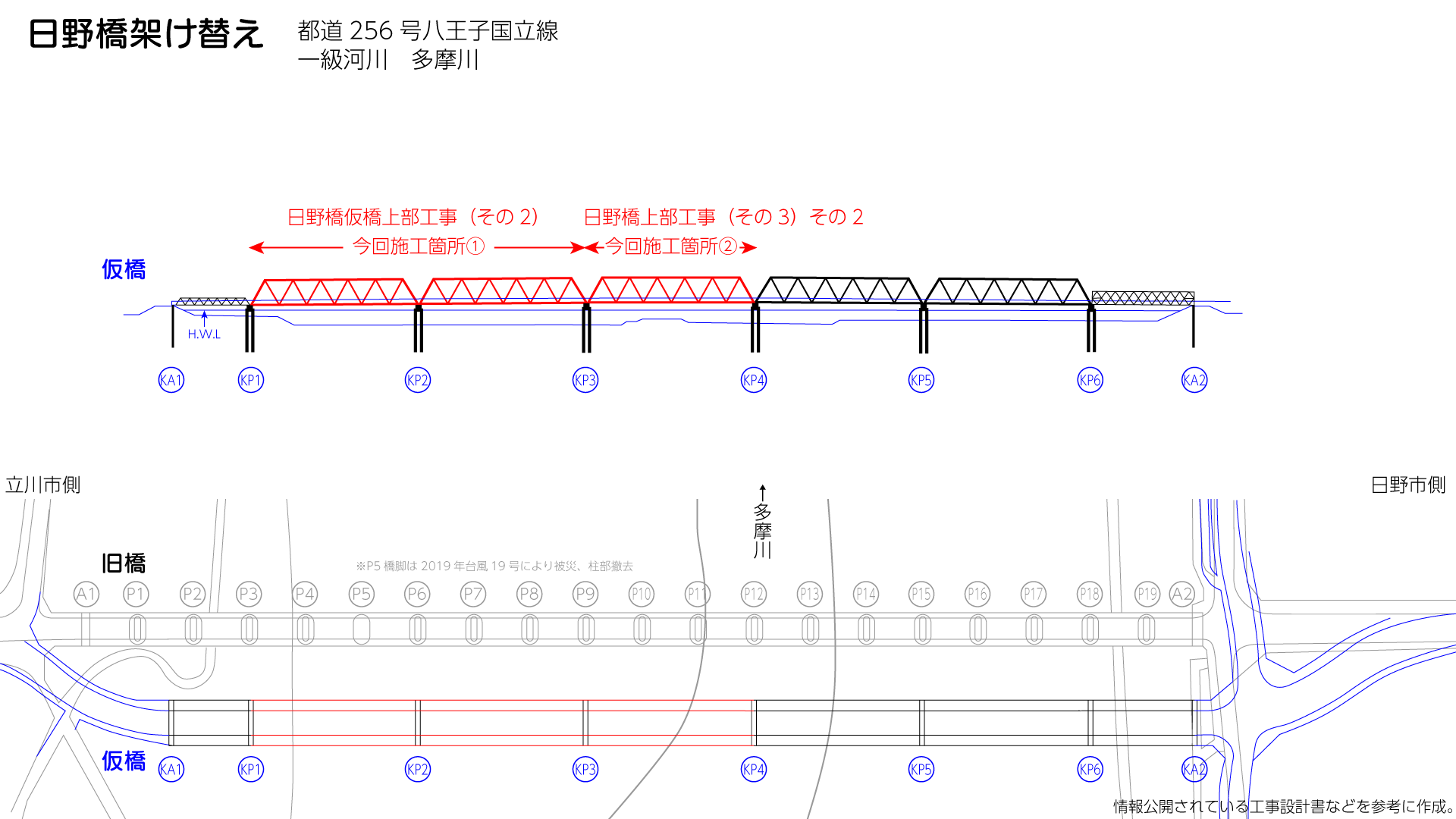 今年度は、日野市側上部工のほかに、立川市側の下部工と上部工1径間の設置工事も別業者により予定されています。