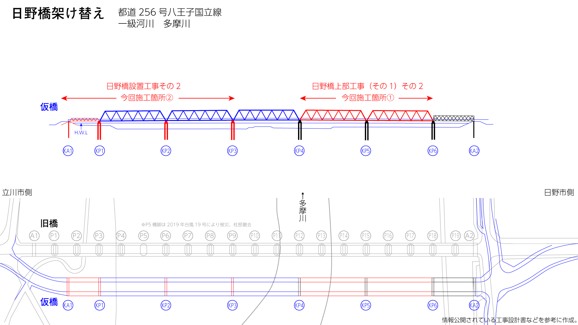2022年2月17日には、上部1径間を製作・架設する「日野橋仮橋上部工事(その3)その2」の入札が行われ、株式会社駒井ハルテックが落札しています。
