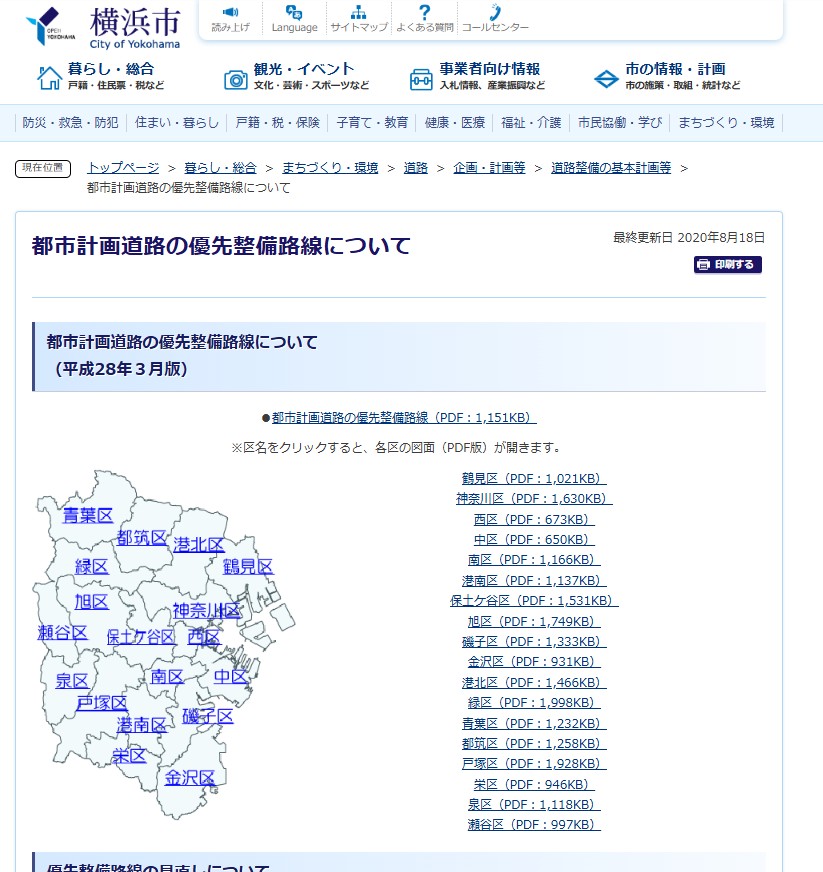 横浜市では、この『都市計画道路の優先整備路線』を市のウェブサイトに公表していました。