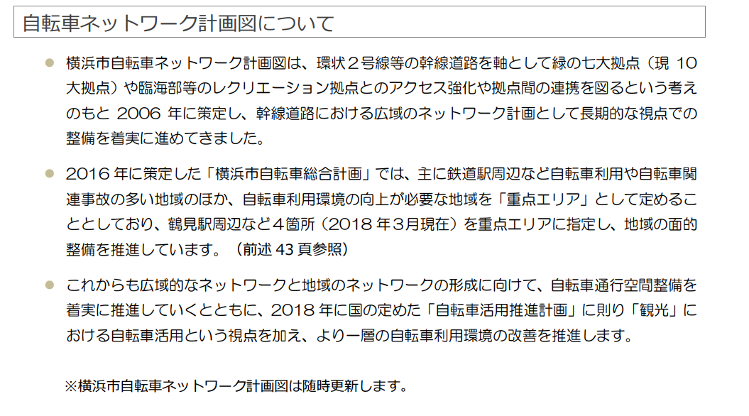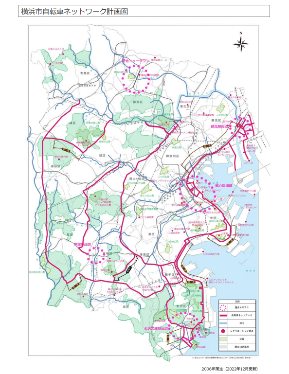 横浜市自転車活用推進計画』においては、「横浜市自転車ネットワーク計画図」を定めて、自転車ネットワークと重点エリアを定めています。重点エリアは先の『指針』を引用する形を取っており、「横浜市自転車ネットワーク計画図は随時更新します」という文字が添えられています。