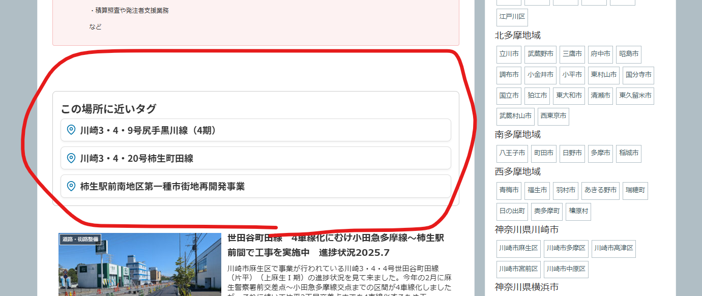 各タグのアーカイブページに、そのタグに近いタグへのリンクを設定してみました。(現時点ではお試しで川崎市麻生区内のタグのみです)
