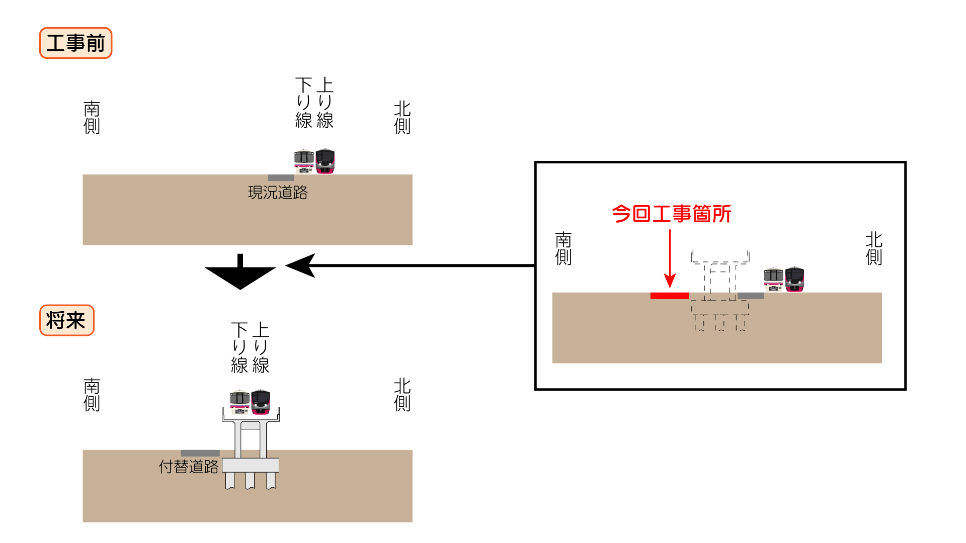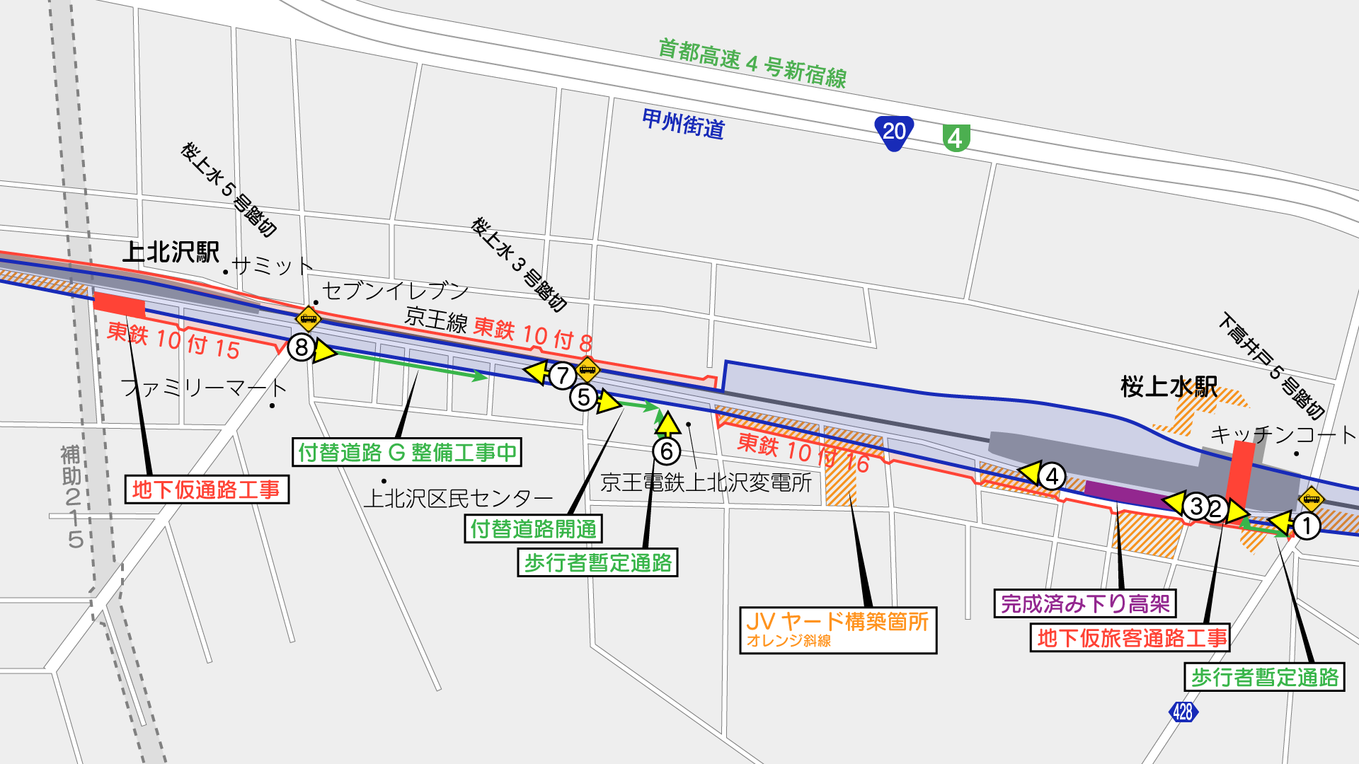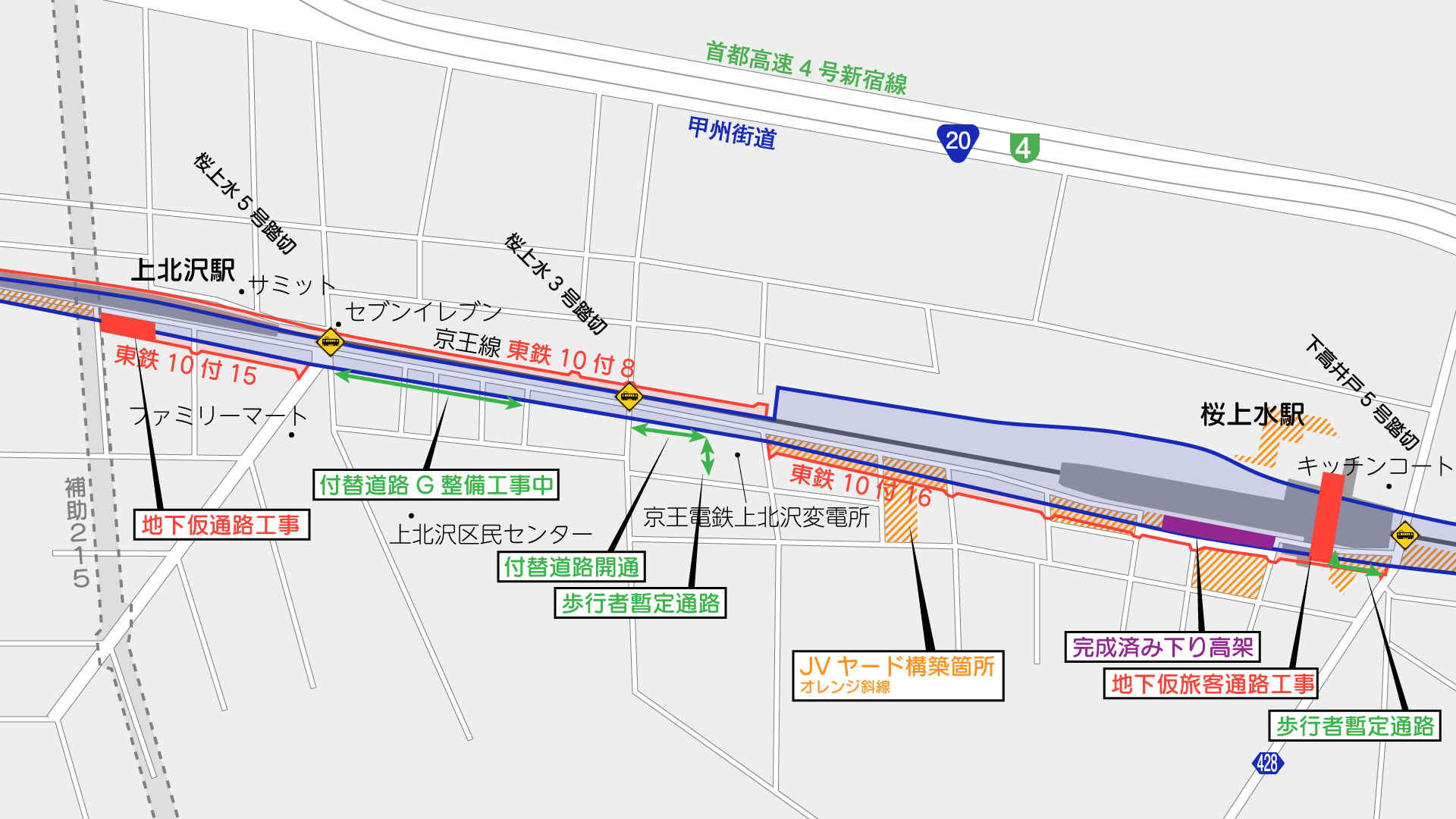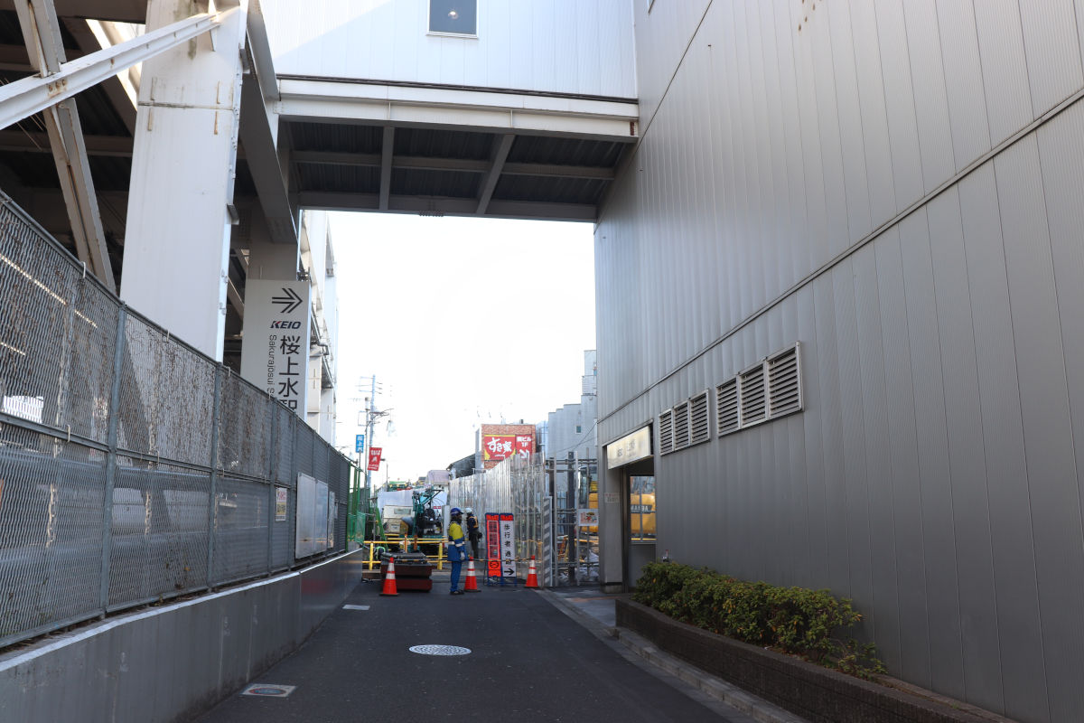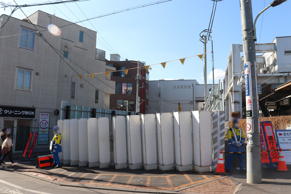 桜上水駅では駅舎の仮設化に向け地下通路整備が進められているほか、上北沢駅寄りでは世田谷区による付替え道路の整備が進められています。