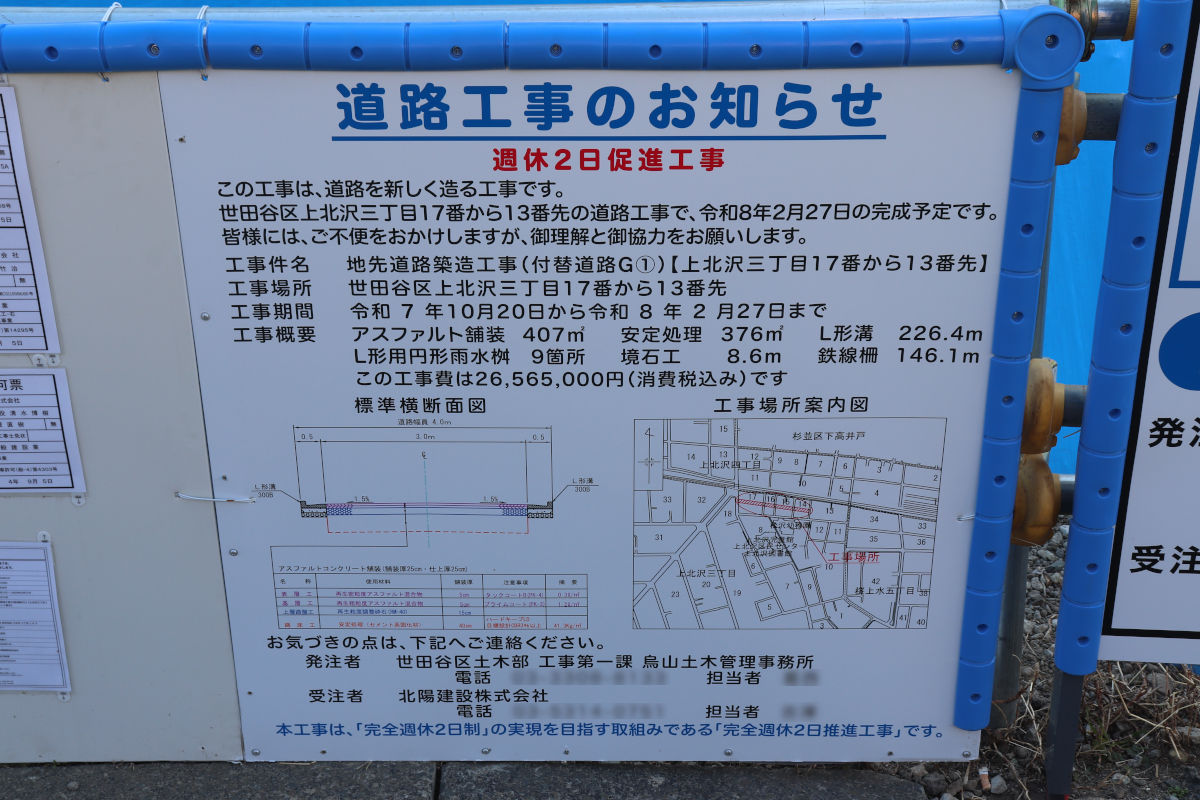 | 工事件名 | 地崎道路築造工事(付替道路G①)【上北沢三丁目17番から13番先】 |