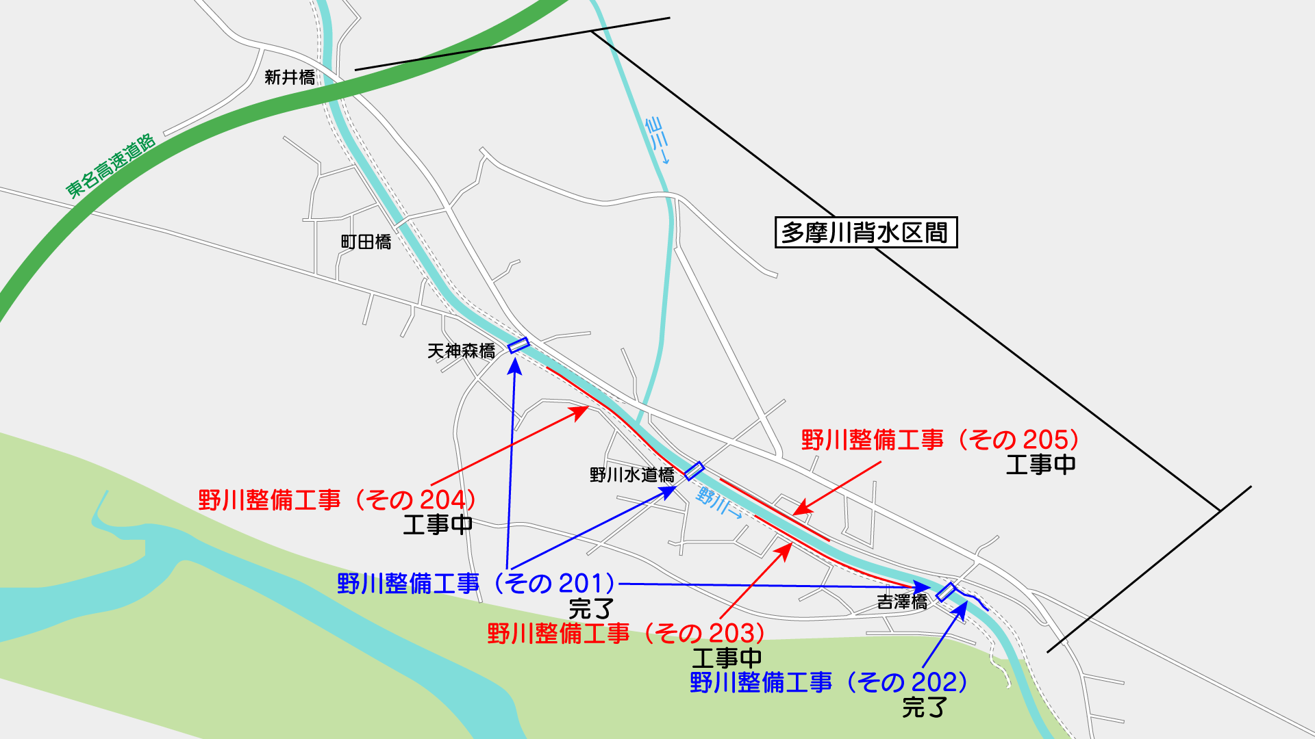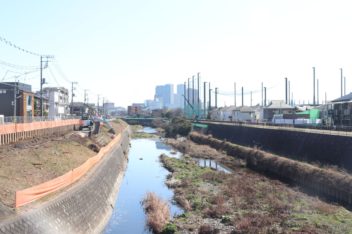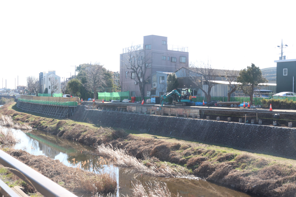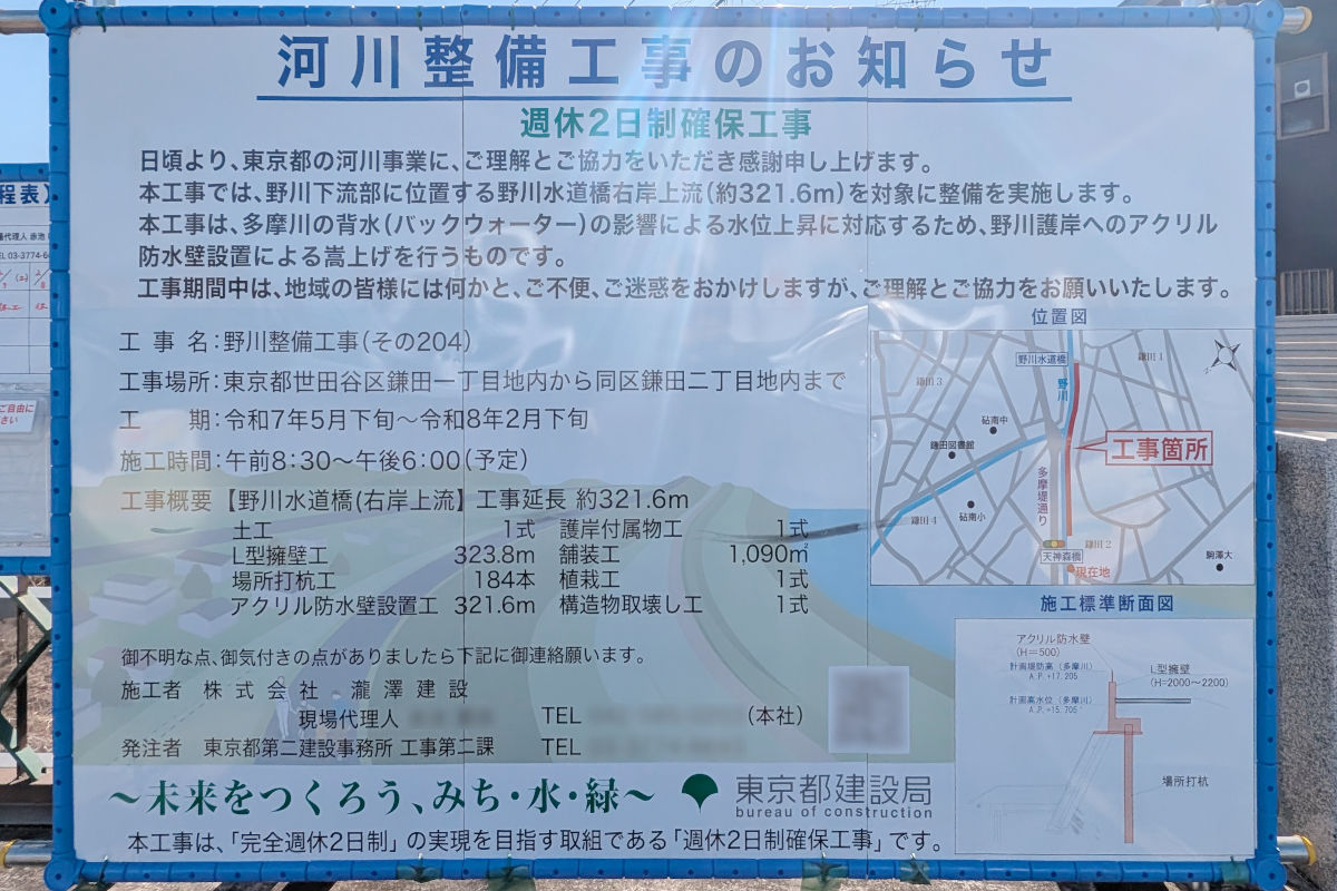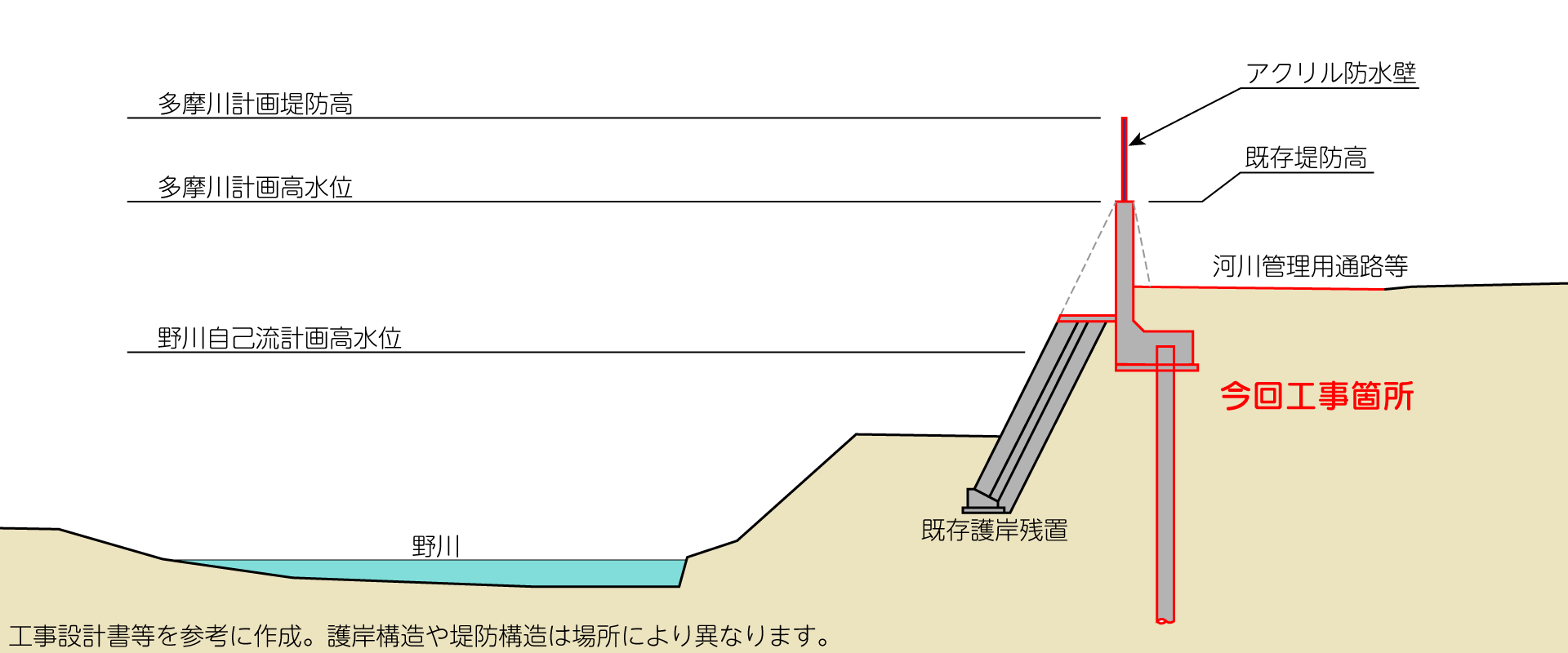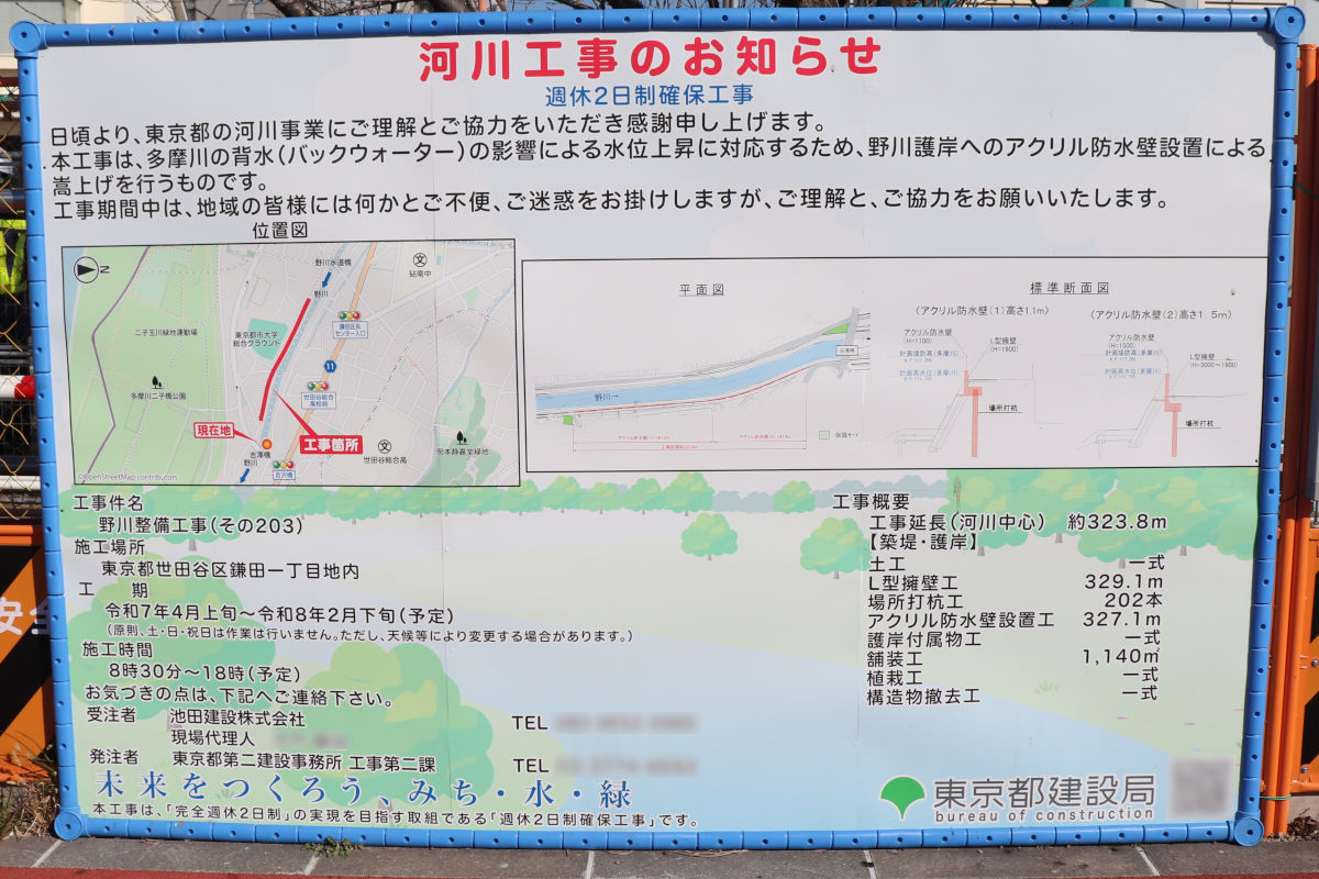 過去の東京都の説明会資料によると、東名高速道路交差部まで堤防の嵩上げまたはアクリル防水壁を設置する計画としており、これら工事もそのその一部と見られます。