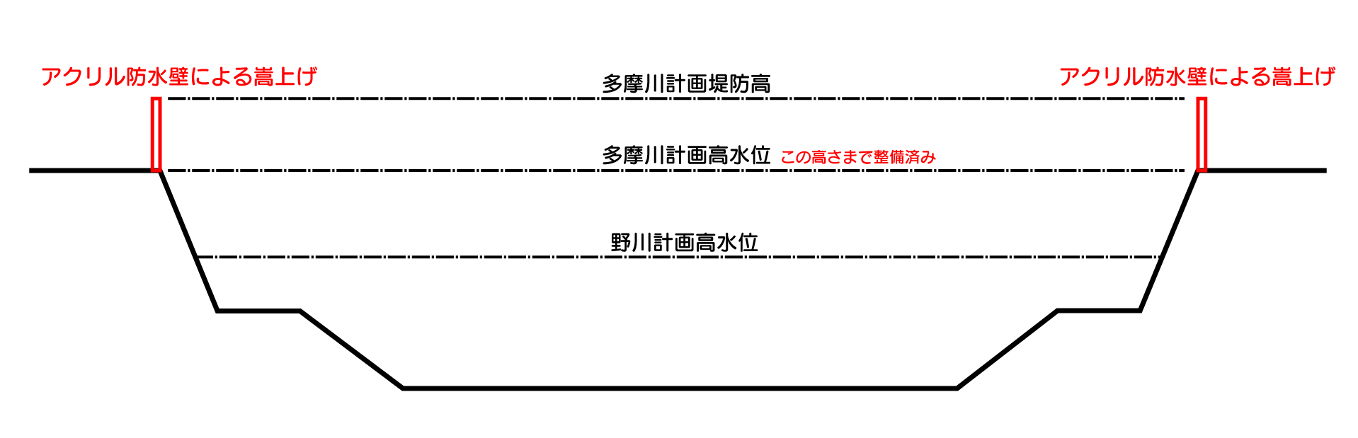 今回、多摩川の計画堤防高まで嵩上げすることで、洪水時の溢水を防ぐことになります。