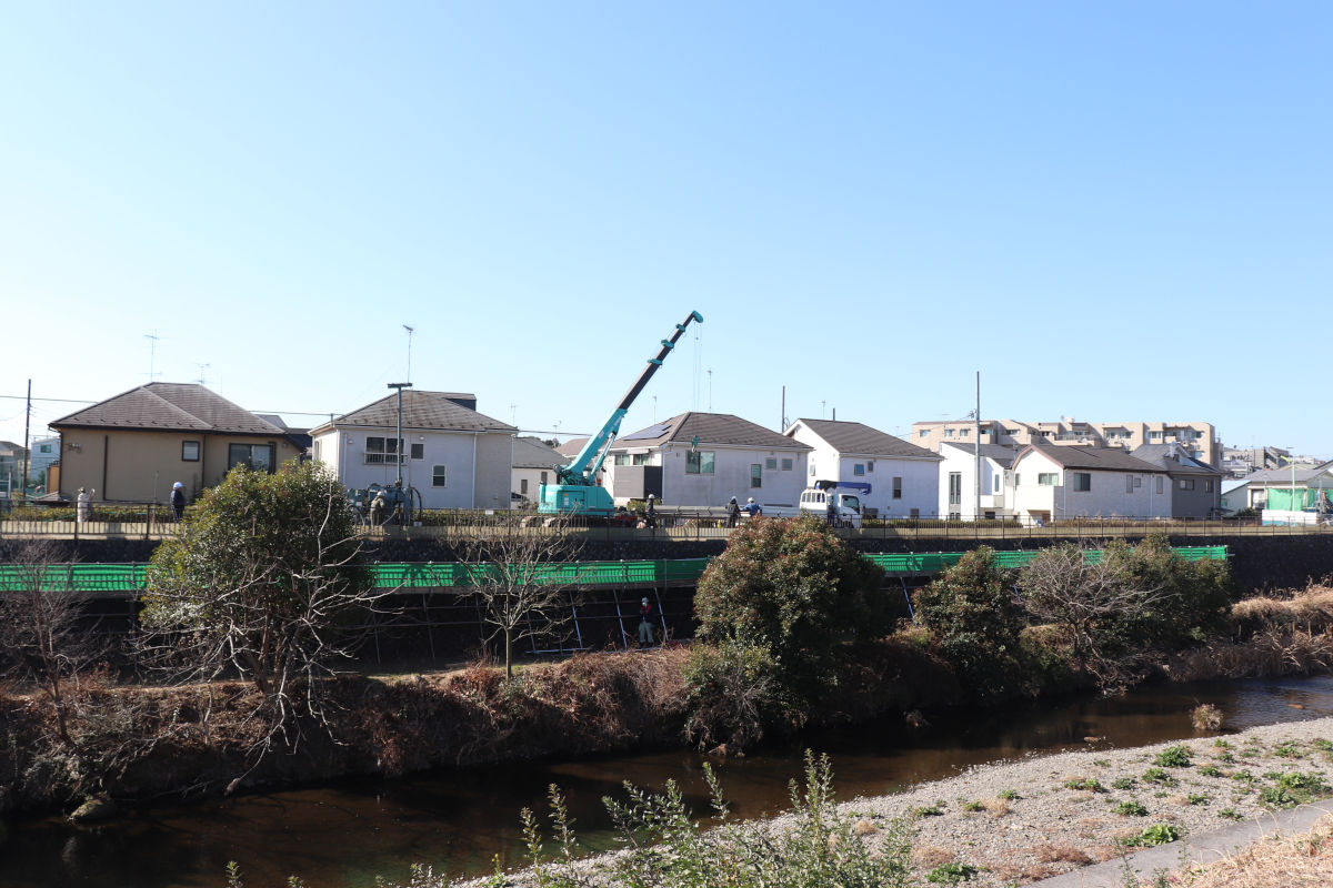 これまで、吉澤橋、野川水道橋、天神森橋と吉澤橋下流右岸でそれぞれ設置工事が完了しており、今回行われている箇所は下記図で赤色で示した箇所です。