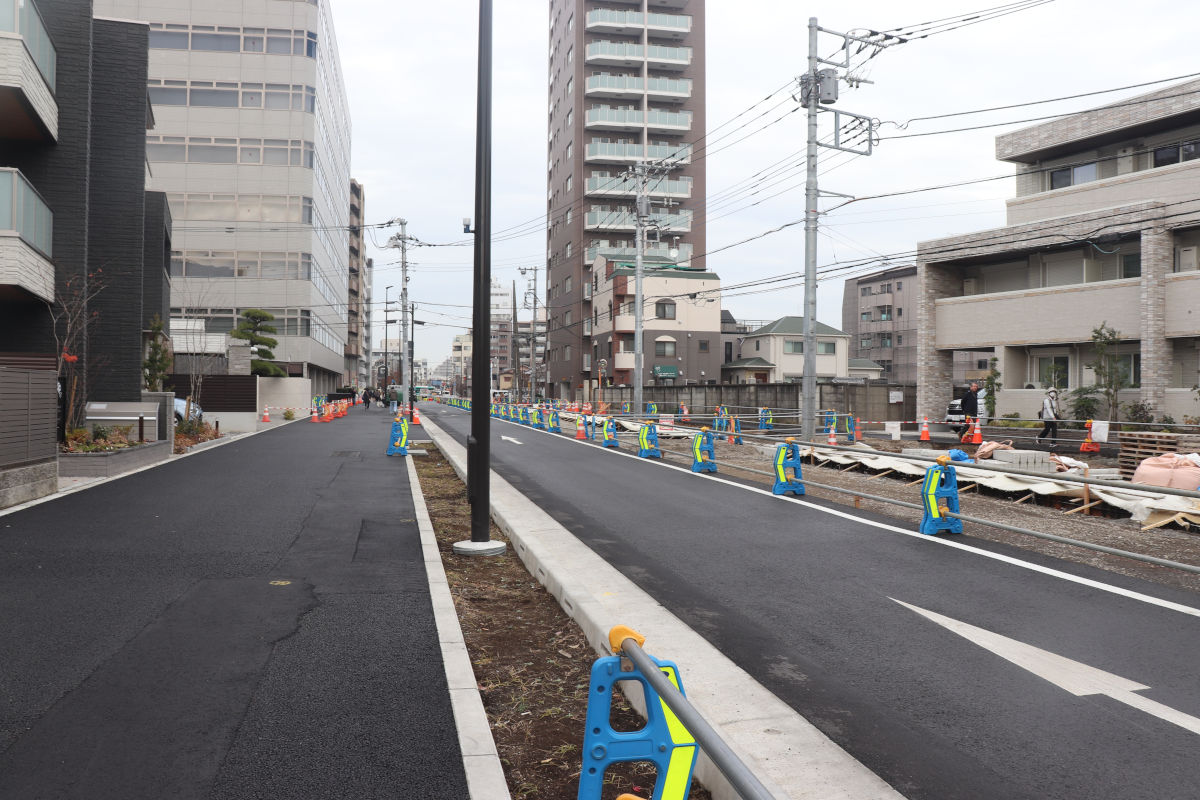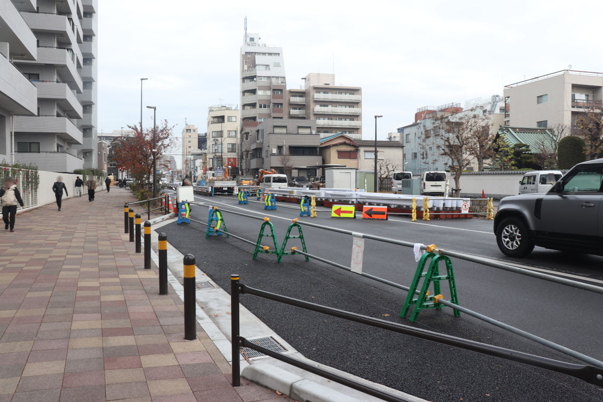 京王線までの区間の相互通行化に合わせて、置きガードレールの撤去や、右折レーンの設置が行われる模様です。