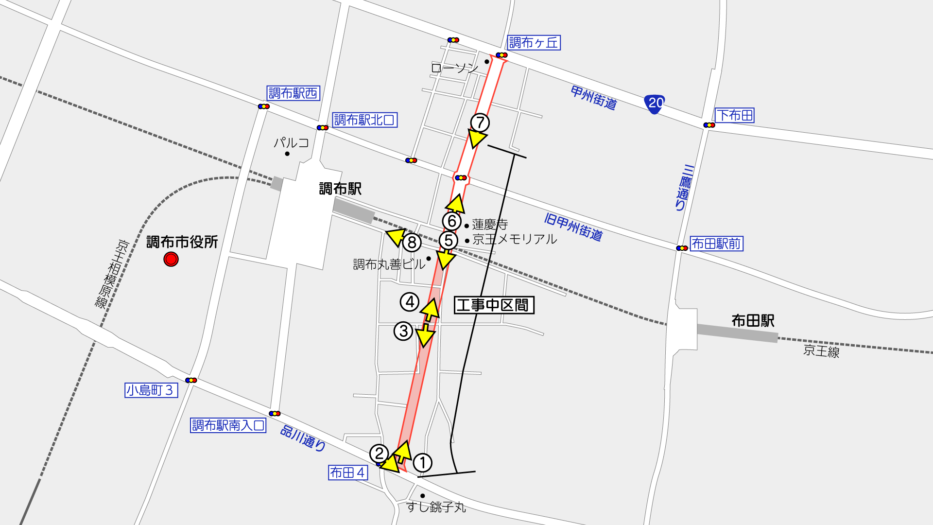 この交差点予定地は、約20m西側の布田4丁目交差点と近接しています。布田4丁目交差点の信号機は廃止される予定です。
