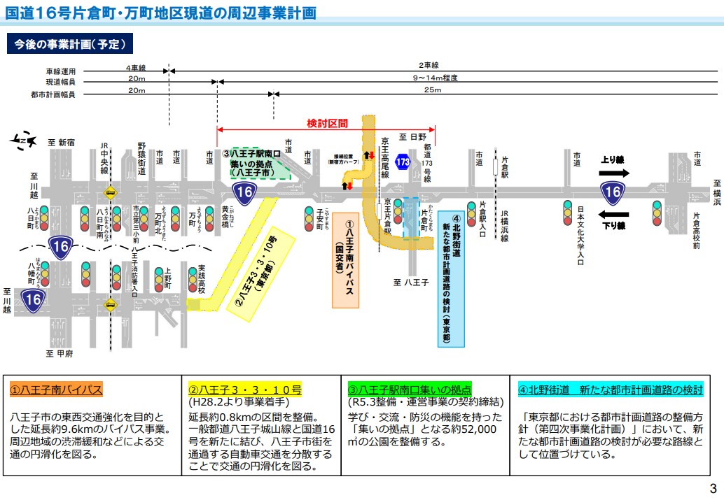 2019年から2024年まで過去5回、国土交通省・東京都・八王子市による「国道16号 片倉町・万町地区 現道対策調整会議」が開催され、片倉町交差点南側付近~黄金橋交差点付近間の対策の検討が行われています。