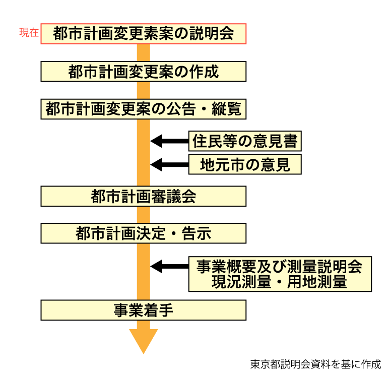 都市計画素案説明会資料によると、法令通りの通常の都市計画変更の手続きを経て都市計画決定する予定で、都市計画決定後は事業概要等の説明会を開催し、事業認可等の手続きを経て事業着手する予定とのことです。
