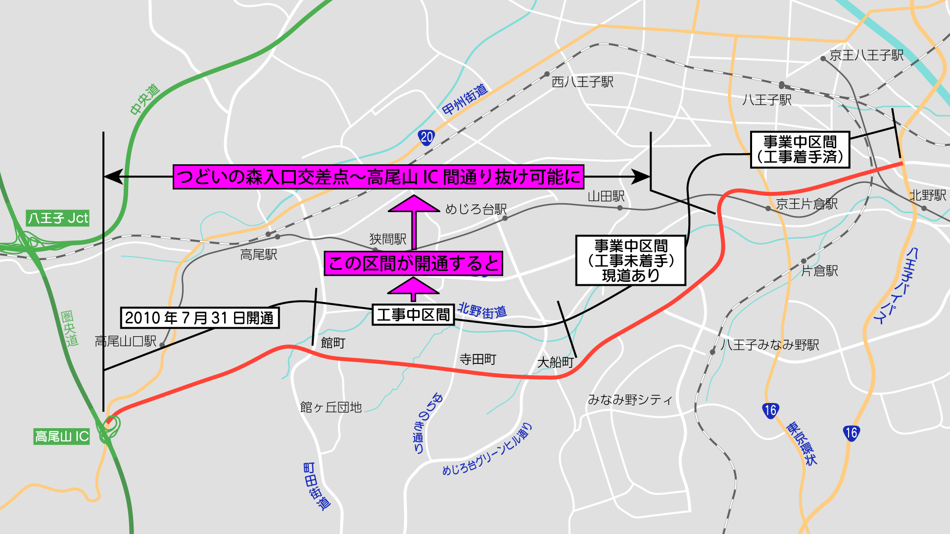 また、八王子南バイパスが全線開通後も、国道16号(現道)東京環状と八王子南バイパスは立体交差となり、ランプは都心方面にしか設けられない予定のため、国道16号(現道)東京環状から高尾山IC方面へはこの区間を経由する必要が生じる予定です。