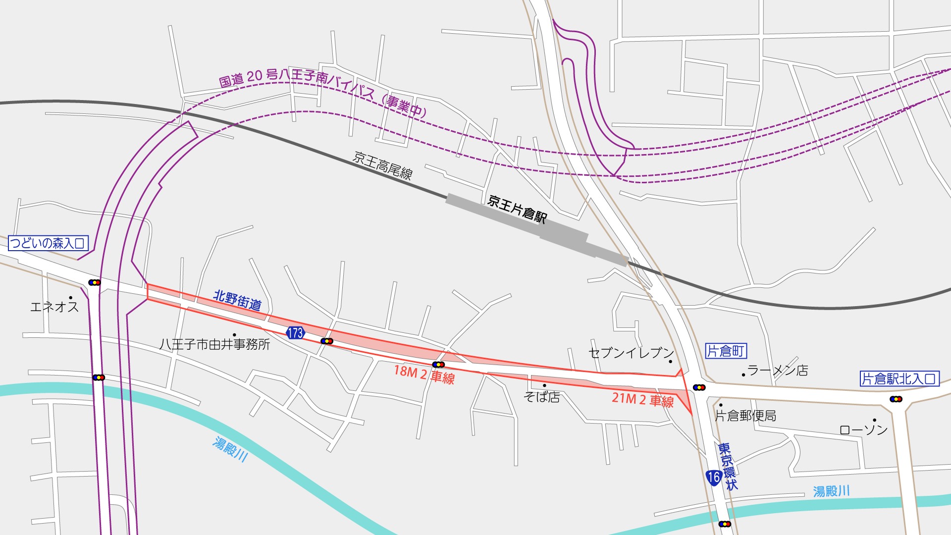 計画幅員は18m(片倉町交差点付近は21m)で、車線数は2となる計画です。