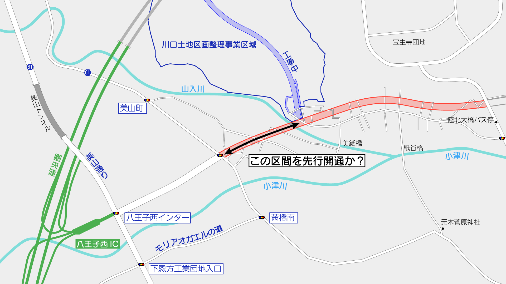 この東側は、秋川街道までの区間で東京都が別途事業を進めているほか、秋川街道~犬目町交差点間でも事業着手に向け準備が進められています。