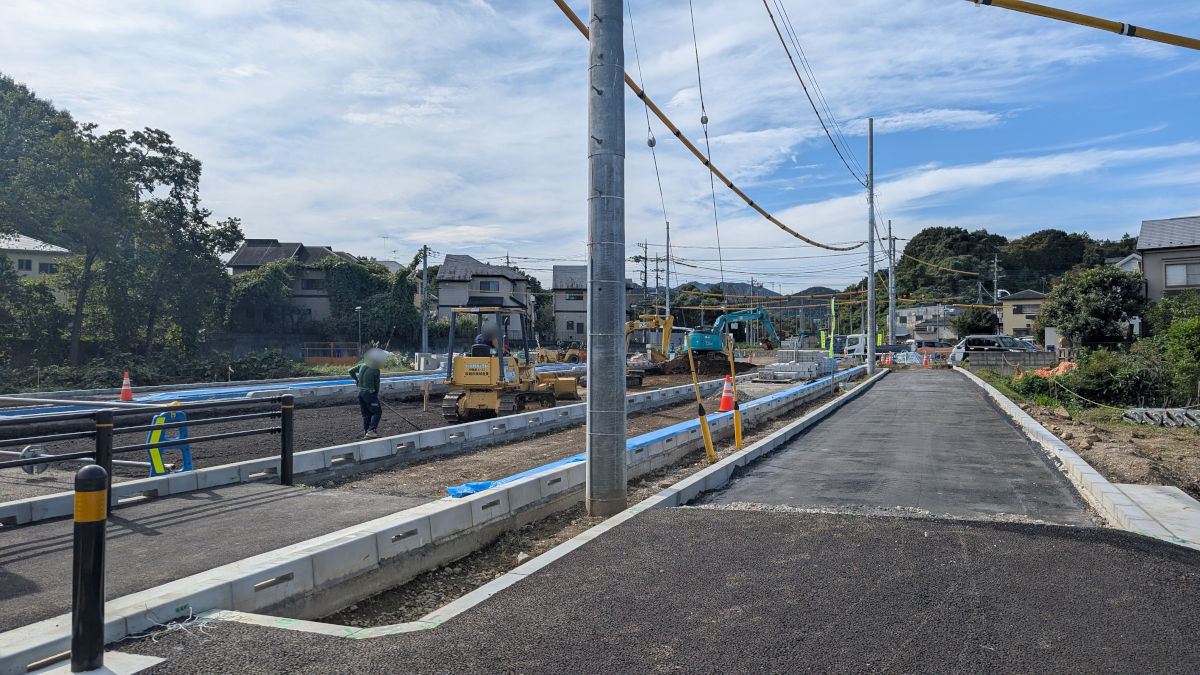 地区内の背骨となる区画道路1号も、おおかた道路形態となっているようで、横断抑止柵の設置や、電柱の建柱が進んでいました。
