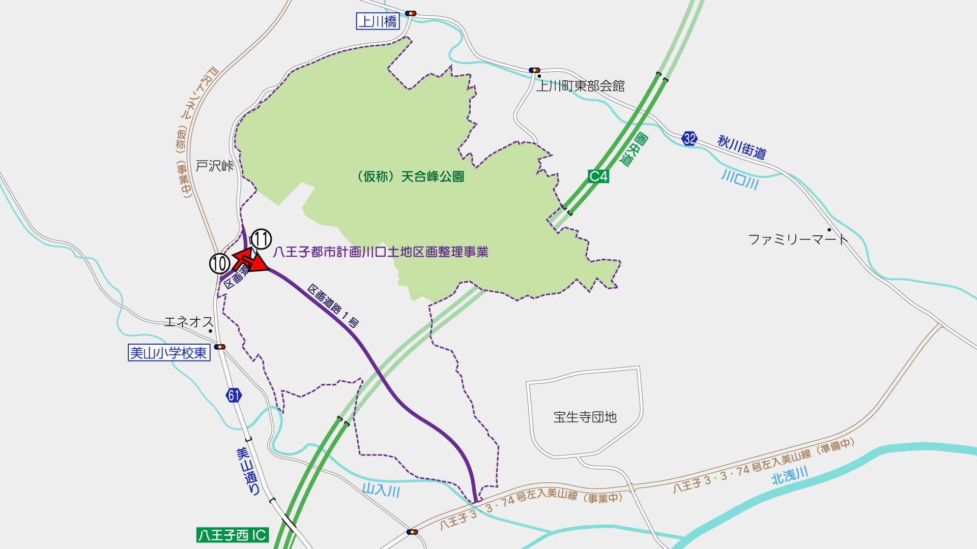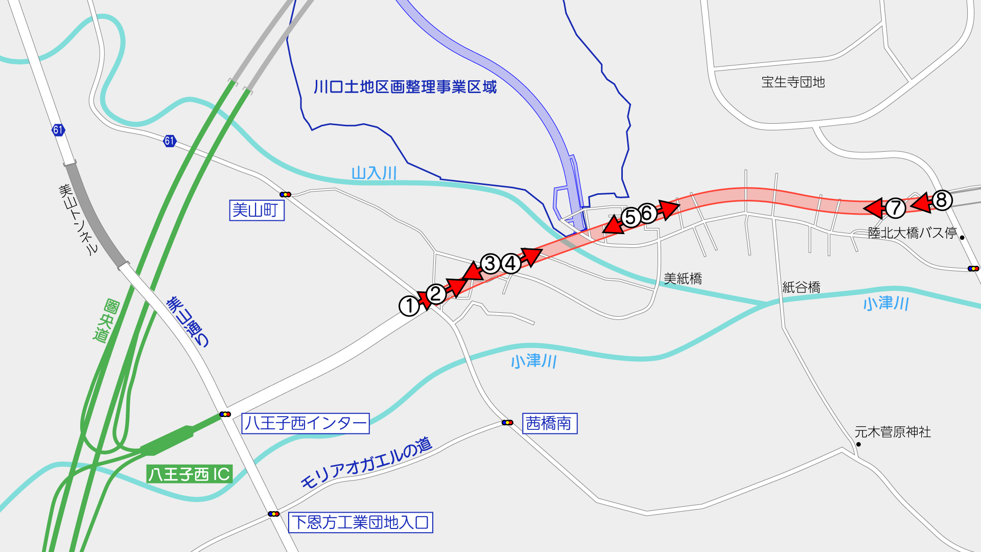八王子3・3・74号左入美山線は八王子市左入町から八王子市美山町に至る延長約8,830mの都市計画道路です。このうち、八王子市西寺方町から八王子市美山町に至る約958.5mの区間で八王子市が事業を行っています。