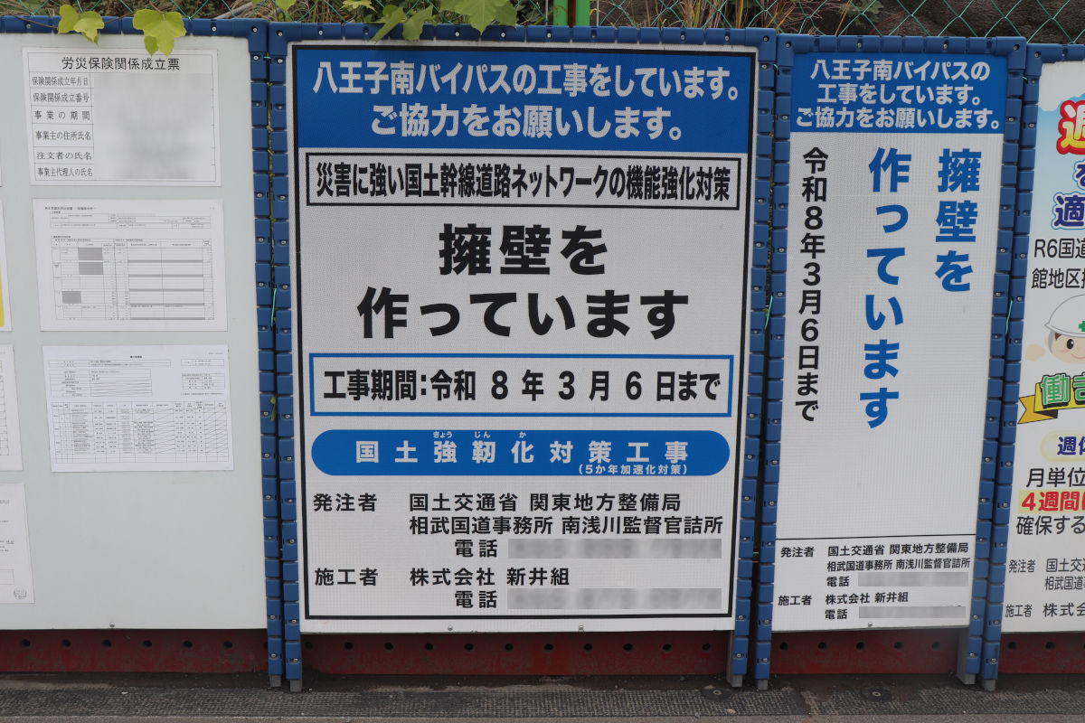 1件目は、「R6国道20号八王子南BP館地区擁壁設置その1工事」で、2026年3月6日までの予定で、株式会社新井組が施工しています。