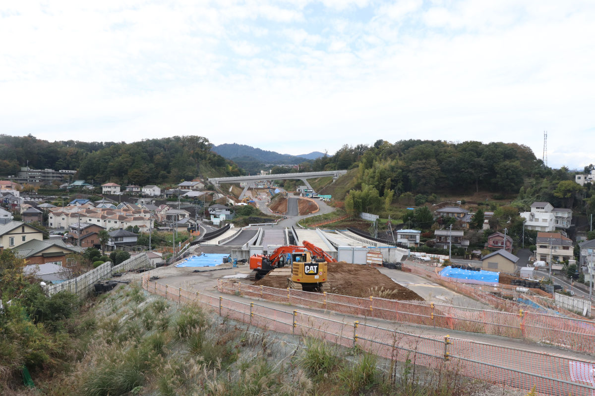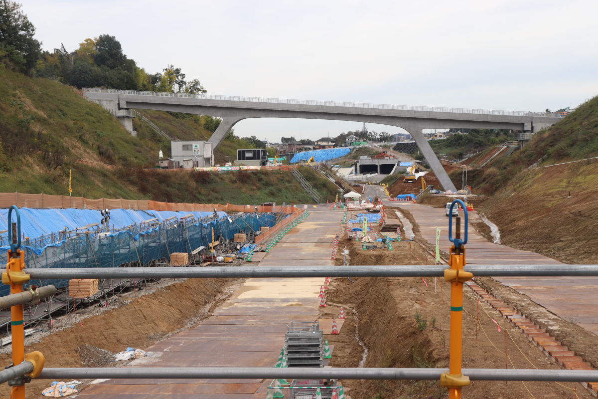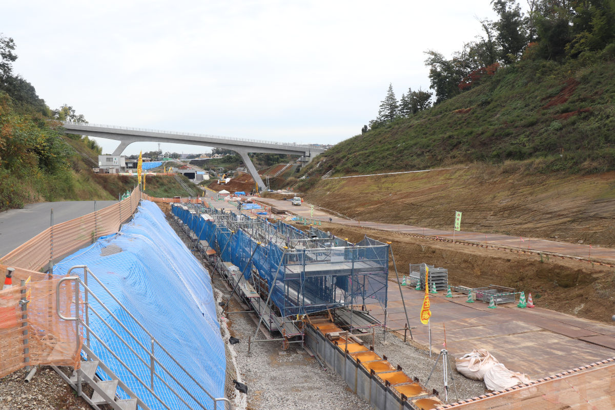下り線側を「その1工事」で、上り線側を「その2工事」で施工し、そのほか掘削も行われ、一部では将来の道路面付近まで掘削が完了します。