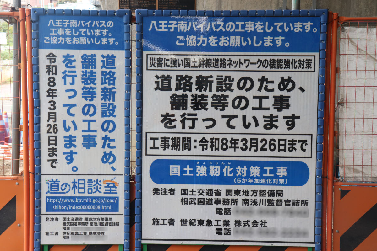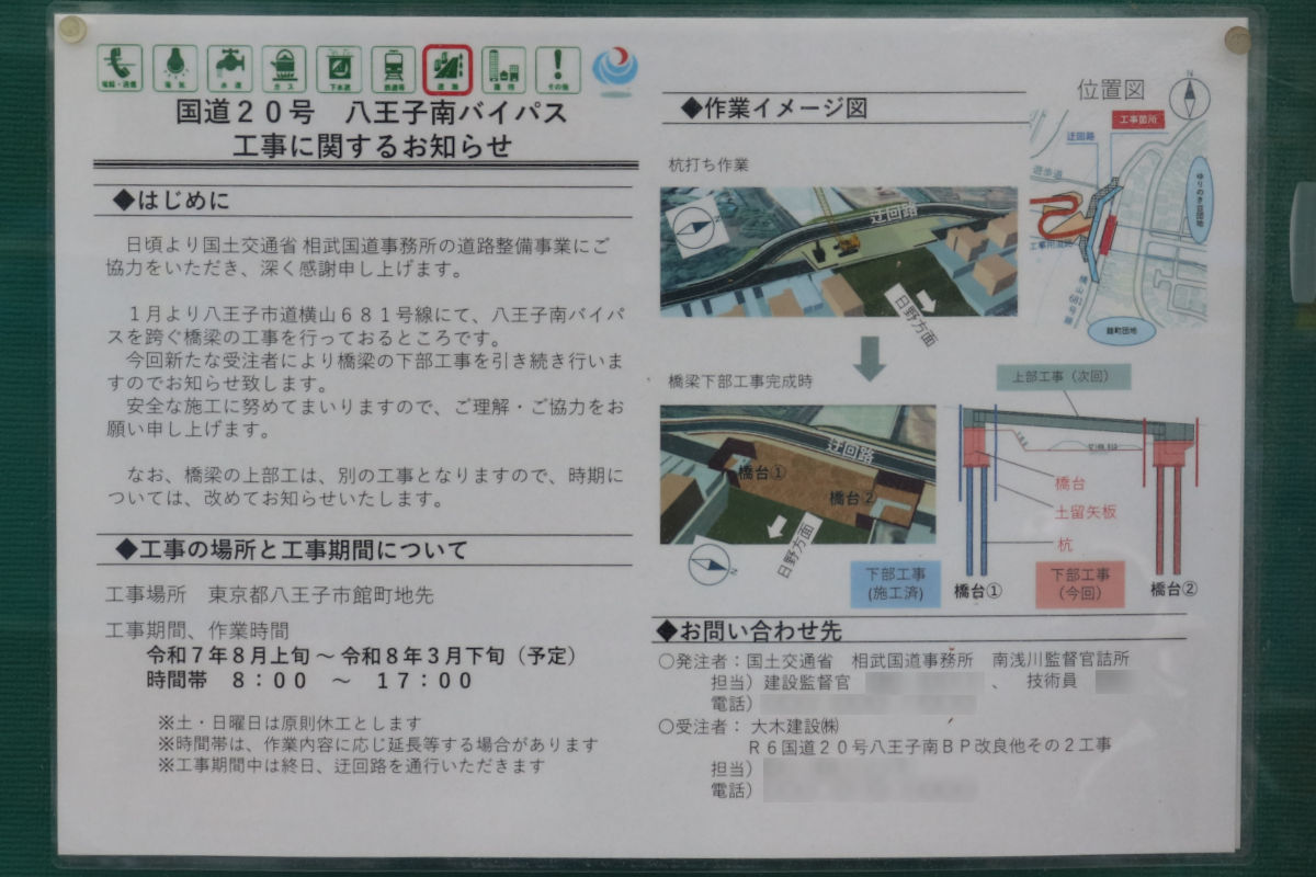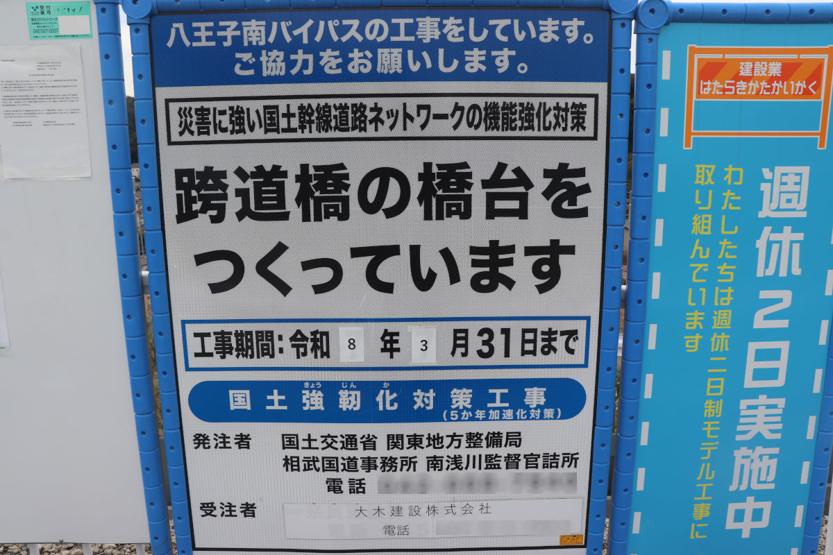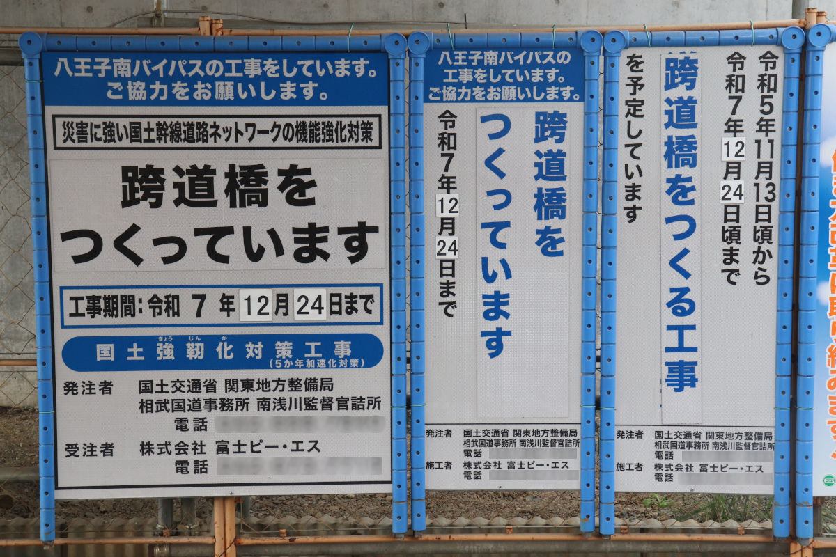 この跨道橋下部工事は、奈良建設株式会社による「R6国道20号八王子南BPゆりのき台跨道橋下部工事」で施工されていましたが、当初契約の範囲すべてを施工しないまま終わり、今回の工事に引き継がれているようです。