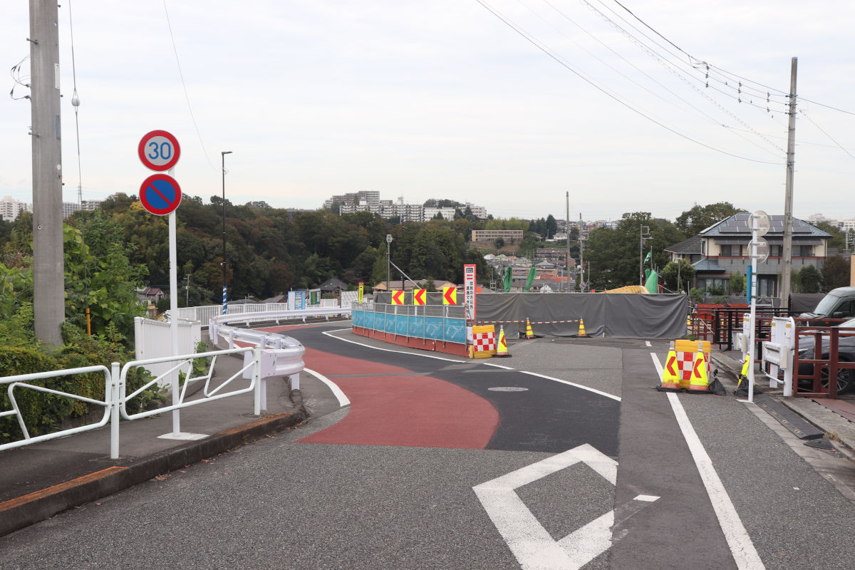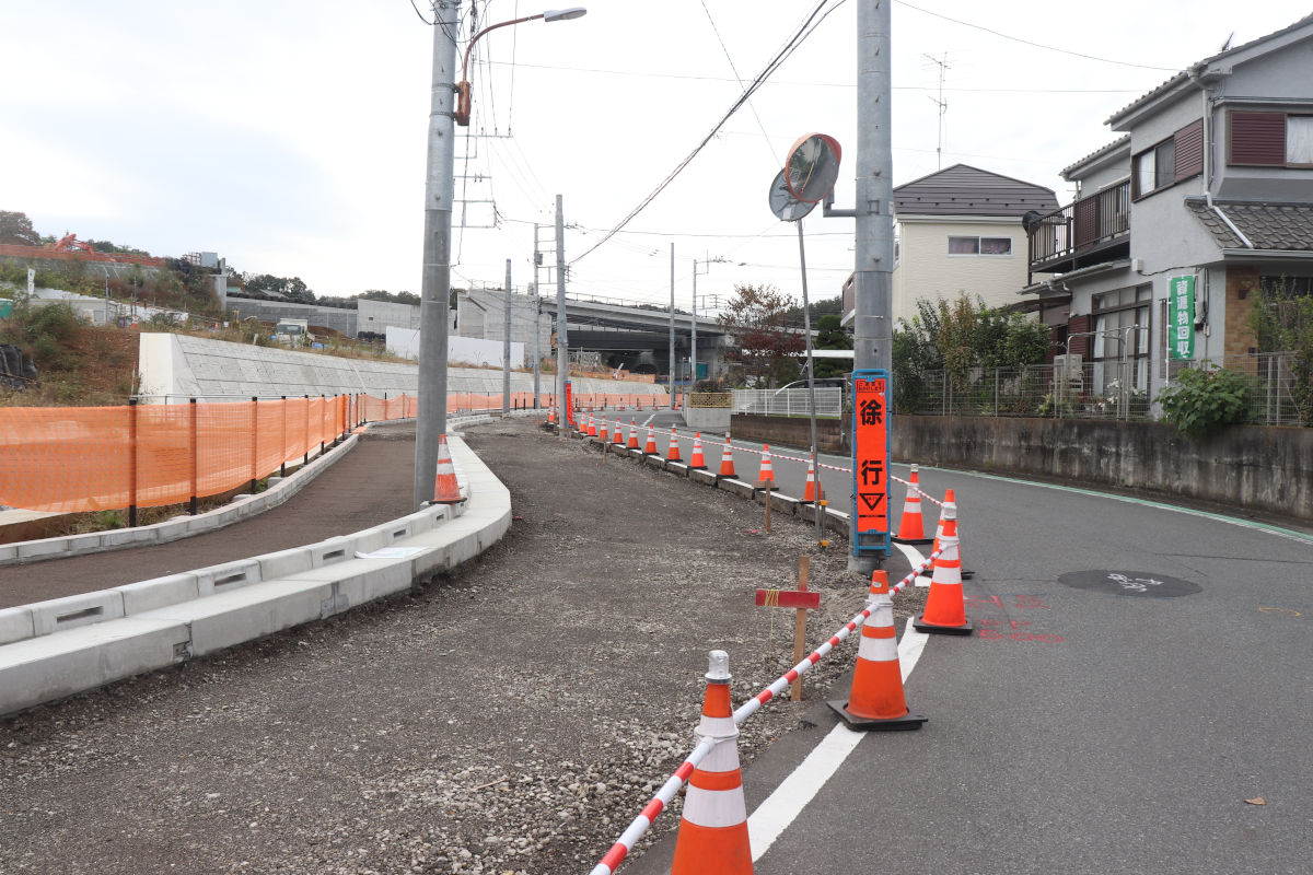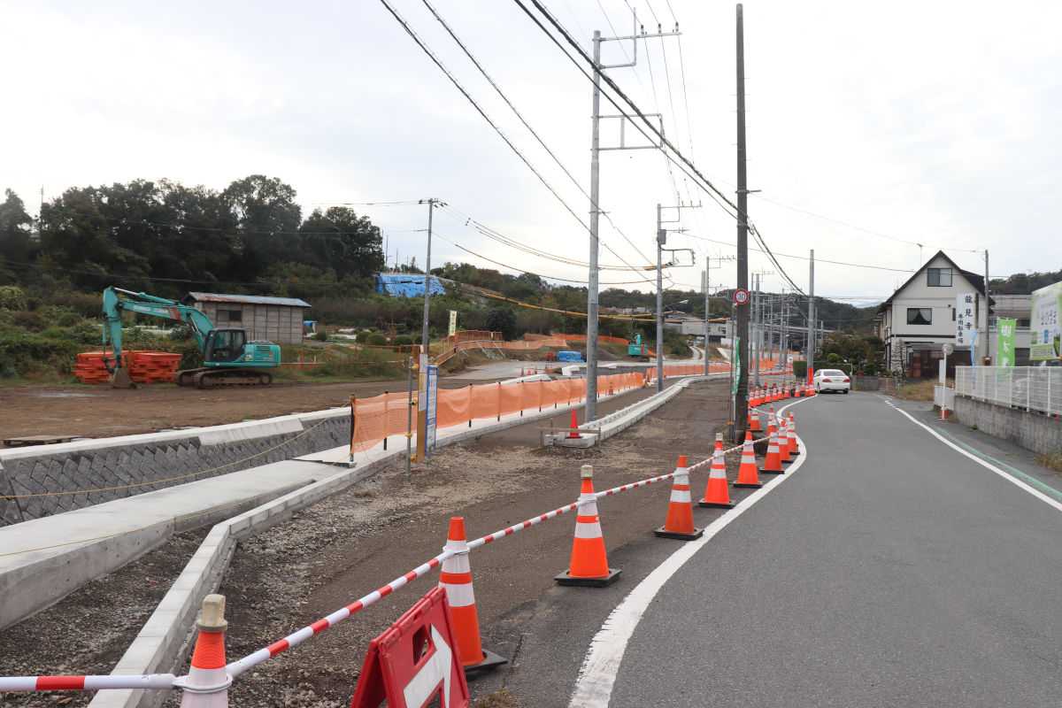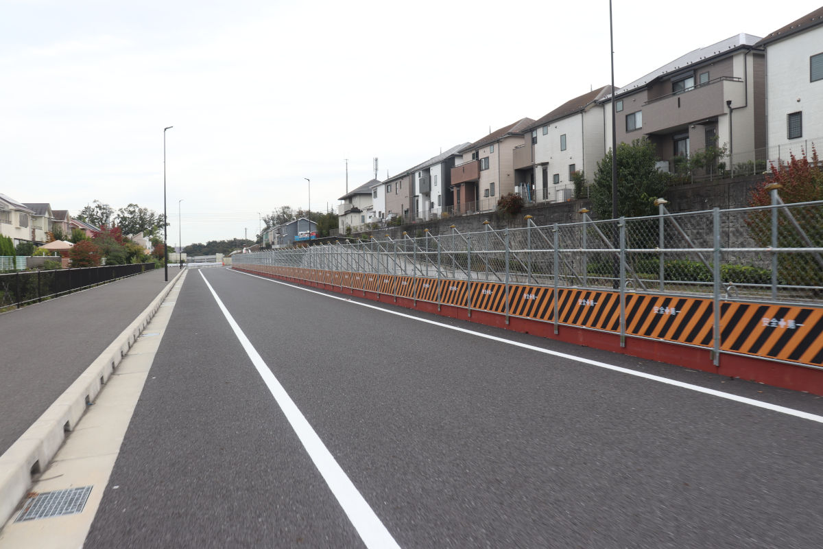 連結側道は、この付近が宅地造成された1990年代に用地が確保され、当時から生活道路として開放されていました。2020年度に側道としての整備が発注(実際の工事は2021年度)され、両側歩道などが整備されましたが、車道部はいわゆる1.5車線道路として暫定開放されていました。