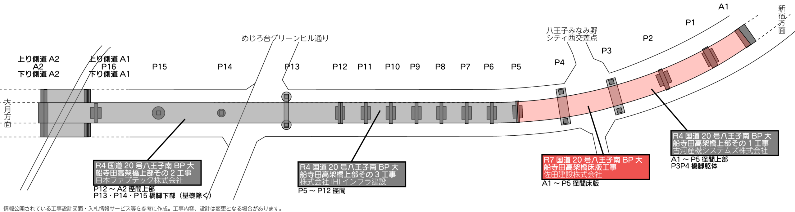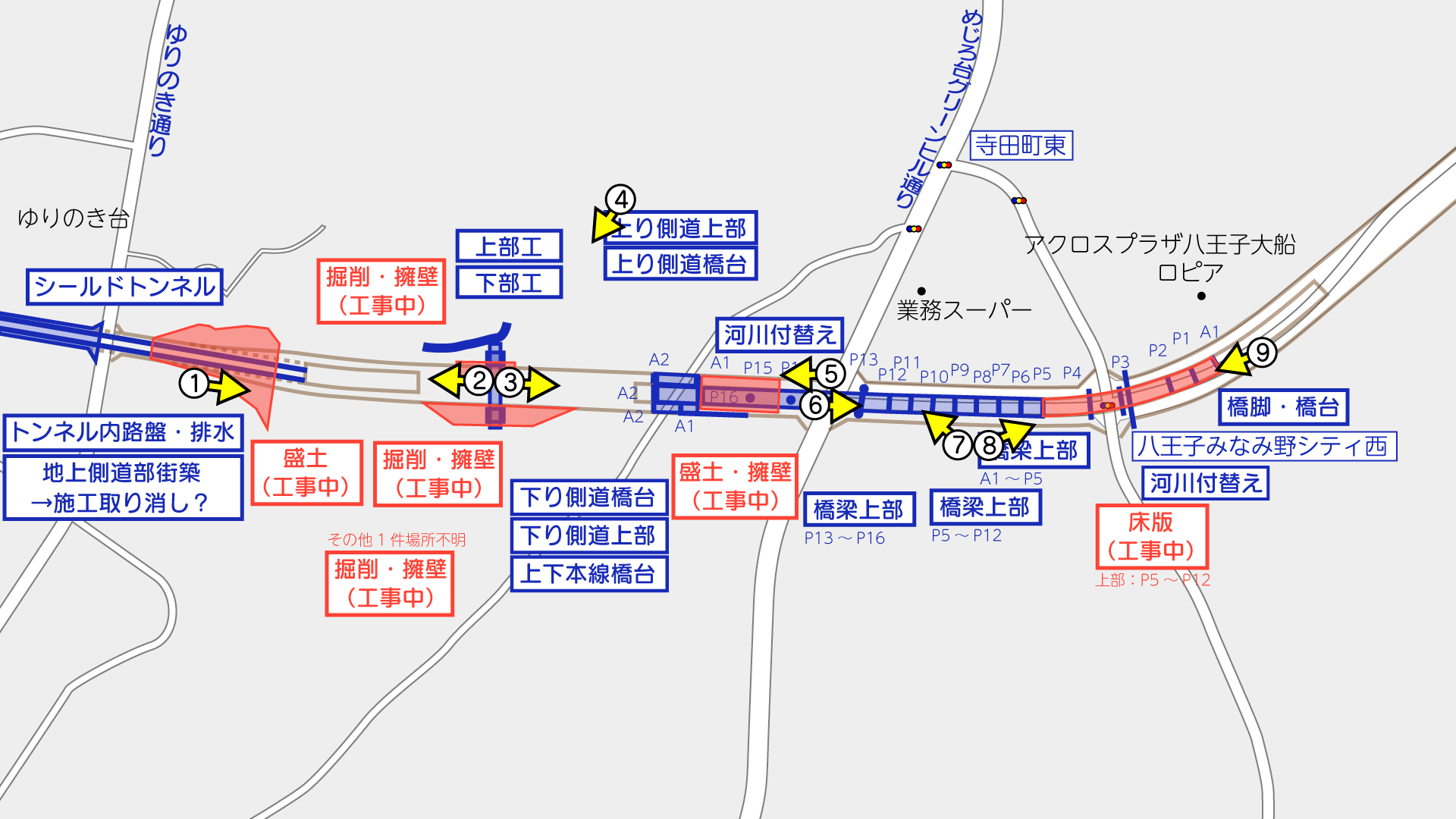 市道横山32号線、めじろ台グリーンヒル通り、都道506号などを跨ぐ大船寺田高架橋は、すべての径間で上部桁架設工事は完了しました。現在は赤色で示した箇所で、床版工事が行われています。