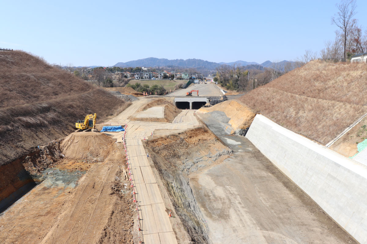 この工事では、写真奥左側の掘削や大型ブロック積み擁壁などの工事も含まれていましたが、見た様子だとこちらも完了または完了に近いと見られます。