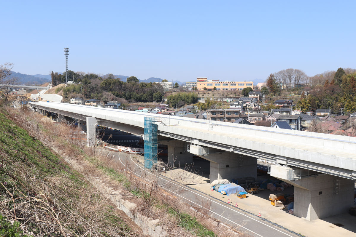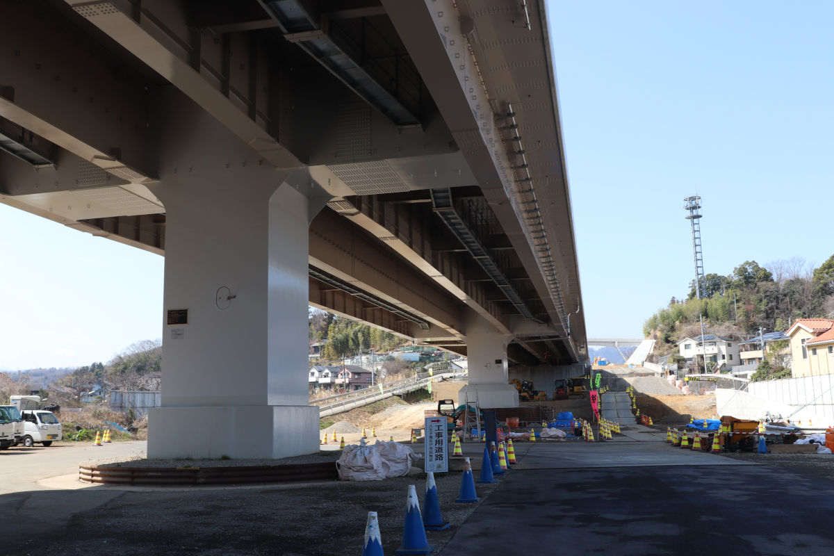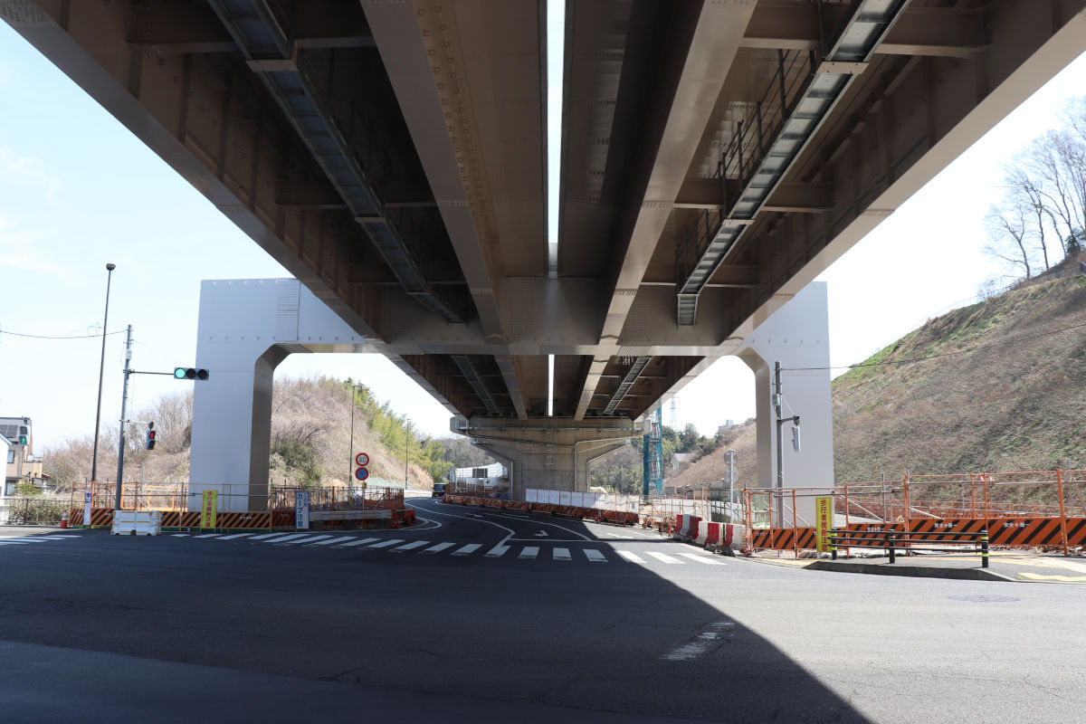 桁は架かりましたが、舗装はまだ行われていません。また、高欄に金具があることから、遮音壁等も今後設置されるものと思われます。