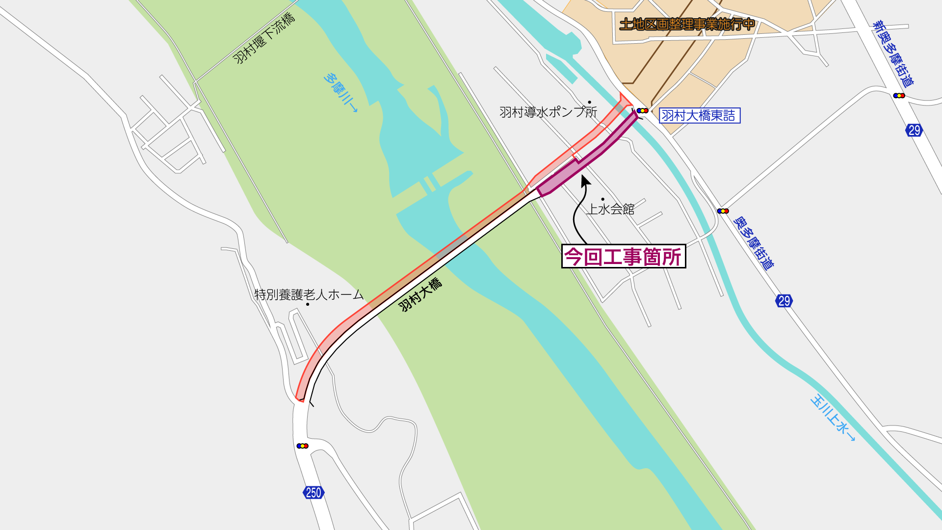 羽村大橋は多摩川に架かるあきる野市と羽村市を結ぶ橋です。道路は都道250号あきる野羽村線です。現在の橋は1974年に竣工したもので、計画幅員の半分(将来の下流側橋)を上下線で供用しています。
