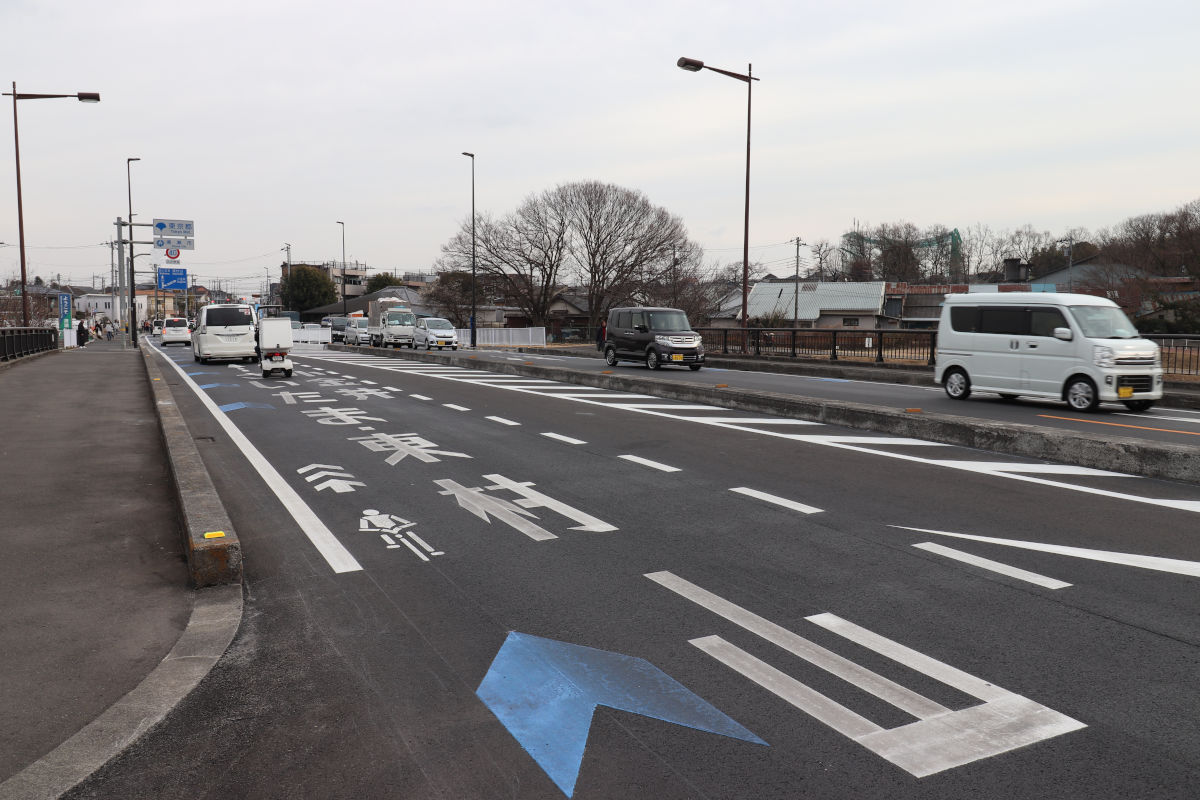 埼玉県側は片側2車線で整備されていますが、現在は下安松交差点で片側1車線に絞る暫定開放となっています。これを上り線は清瀬橋まで片側2車線化する模様で、現在、舗装補修工事が行われていますが、現時点では路面のマーキングと柵を撤去したのみで、舗装本体の工事は始まっていないようです。