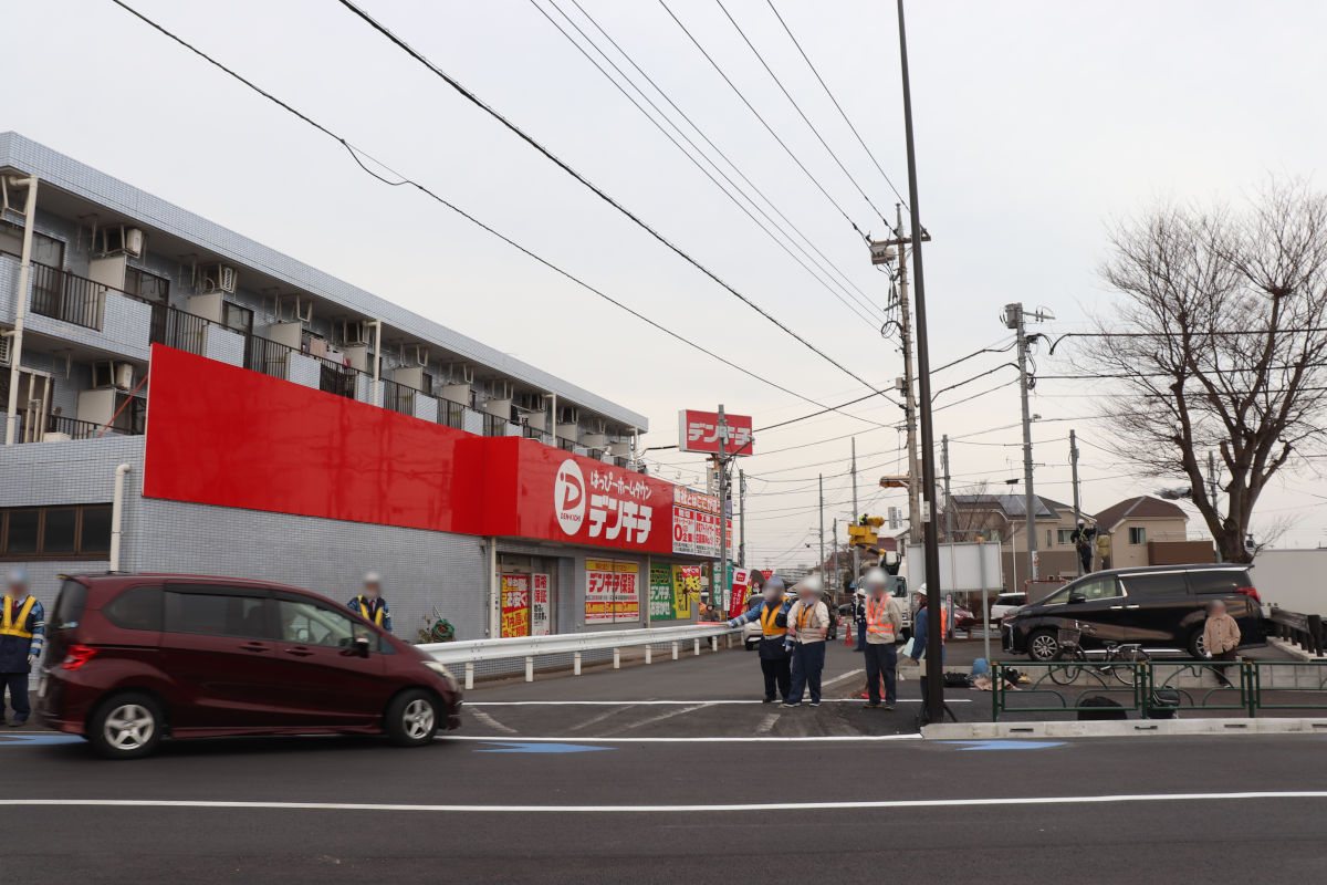 道路の開通に伴い、デンキチ~スギドラック清瀬店方面に至る道路とは交差点になりました。デンキチ~スギドラック清瀬店方面に至る道路は、秋津方面に至る抜け道でそこそこ交通量があります。道路開通で、交差点を抜けられない車が増え、現場の交通誘導警備員が交通誘導を行っていました。