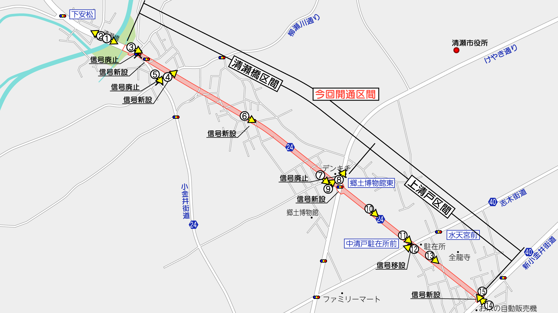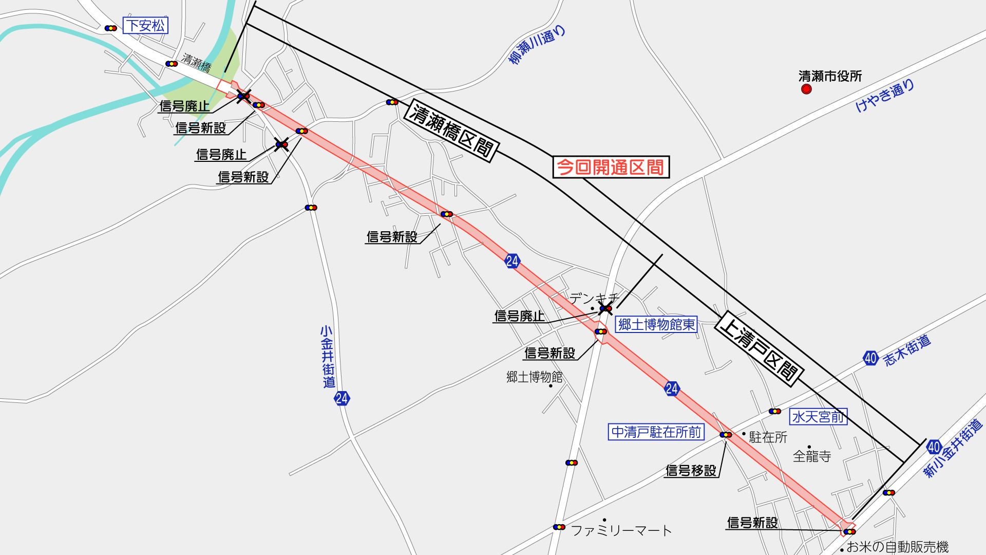 志木街道と交わる交差点には、既存の中清戸駐在所前交差点を移設する形で信号機が設置されました。