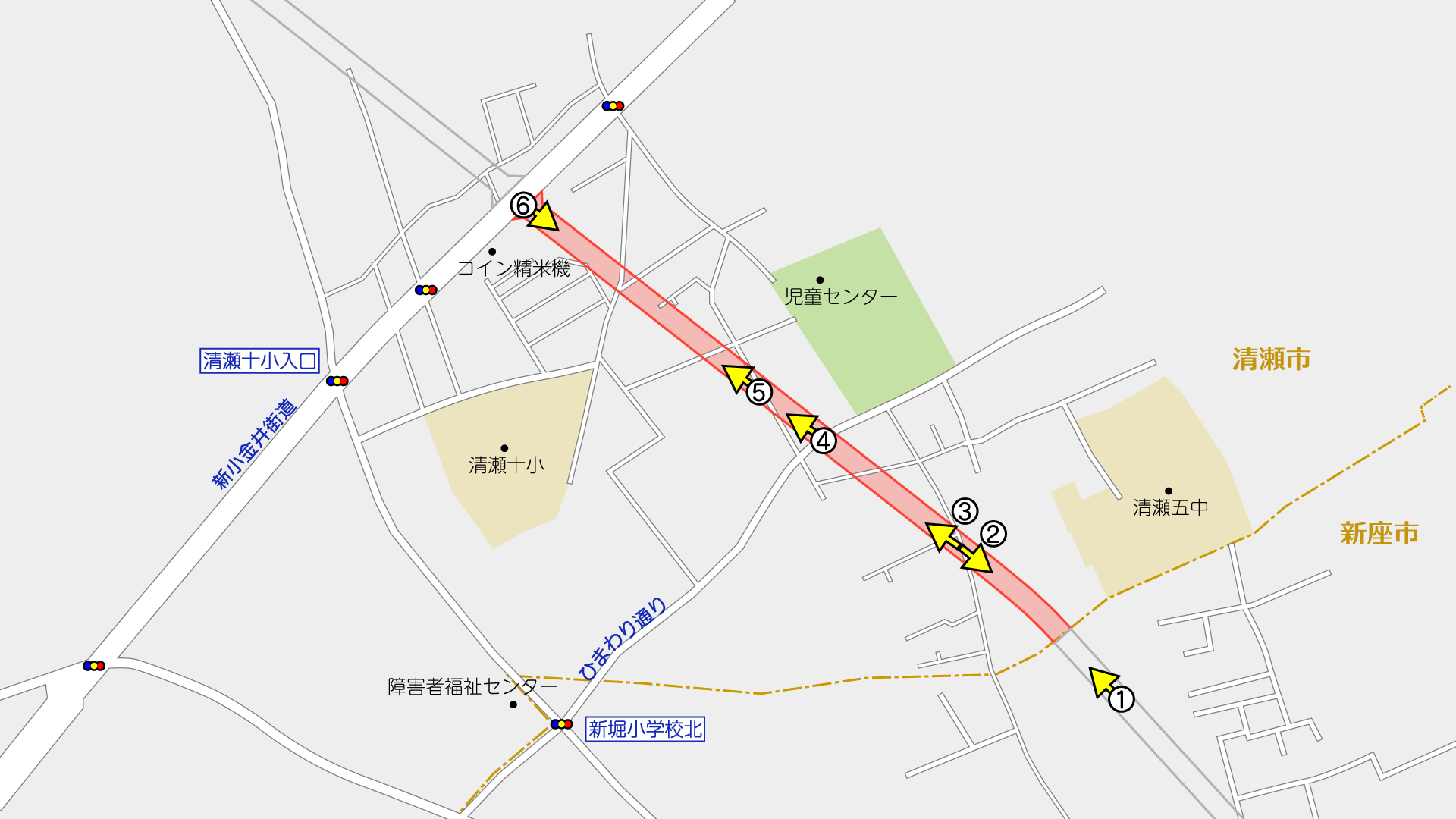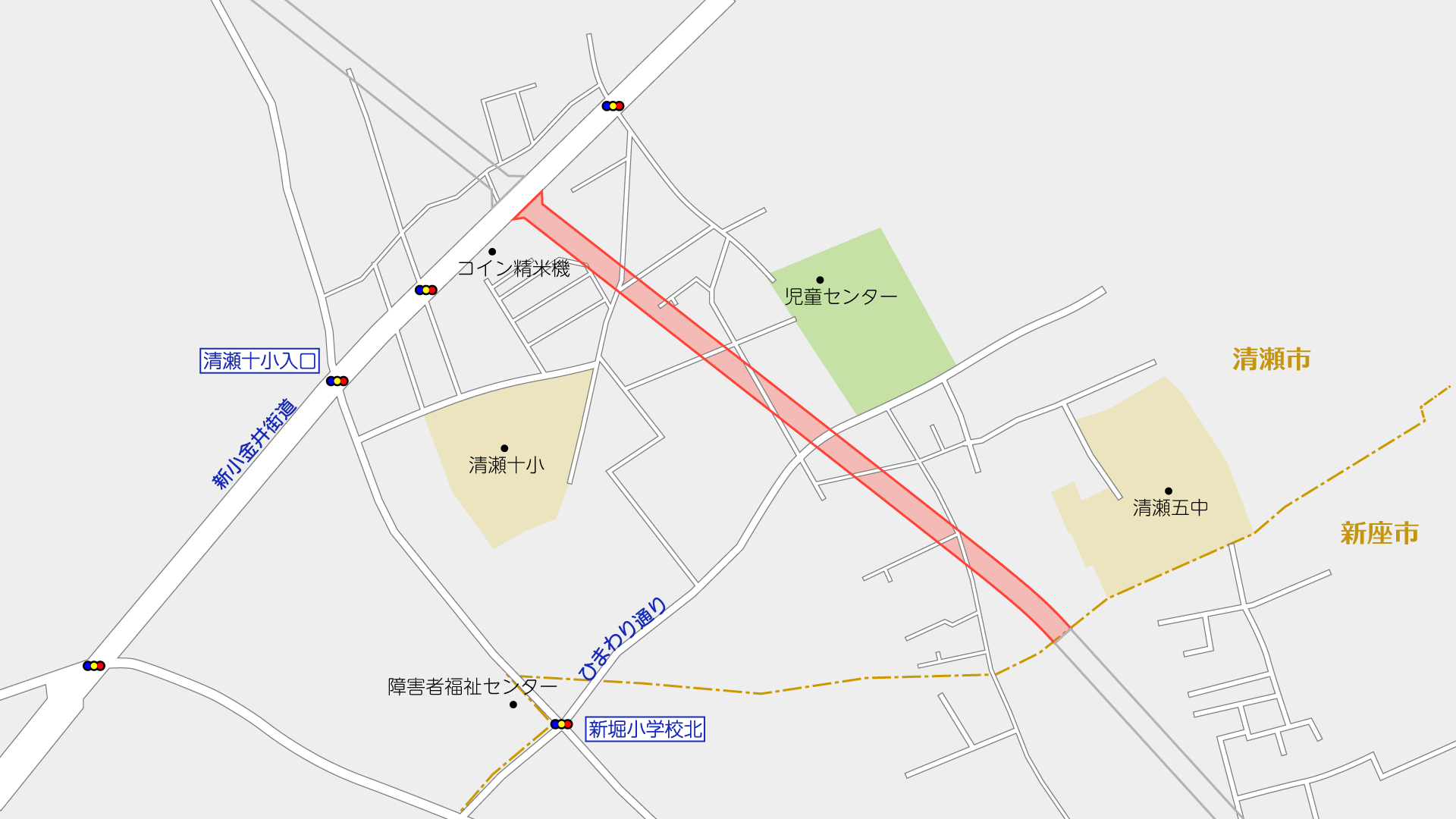 東村山3・4・15の2号新東京所沢線は清瀬市中清戸から清瀬市中里に至る延長2,320mの都市計画道路です。このうち、上記で示す新小金井街道より東側の区間で事業を行っています。