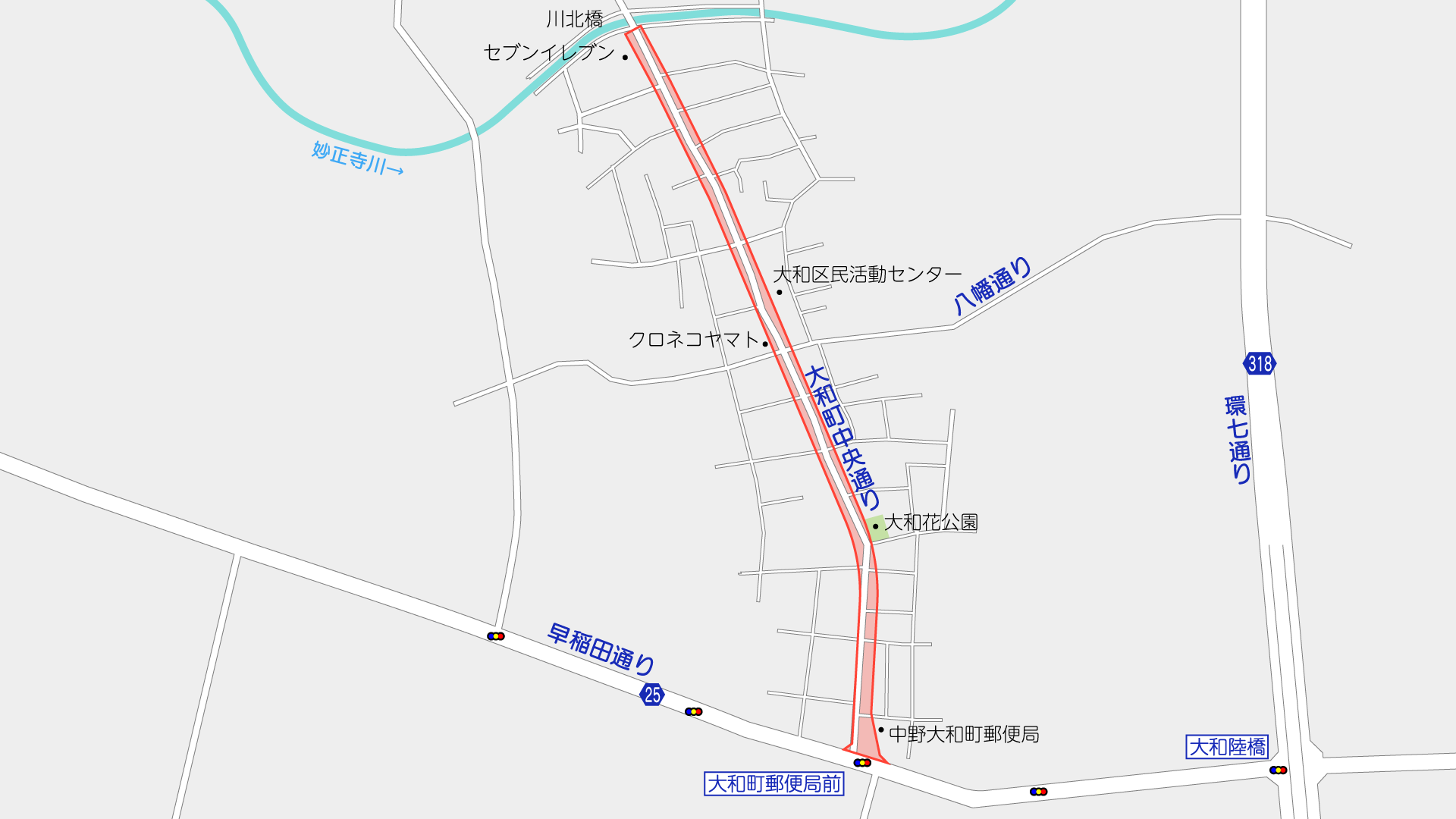 早稲田通りと交わる大和町郵便局前交差点から北側が事業区間です。