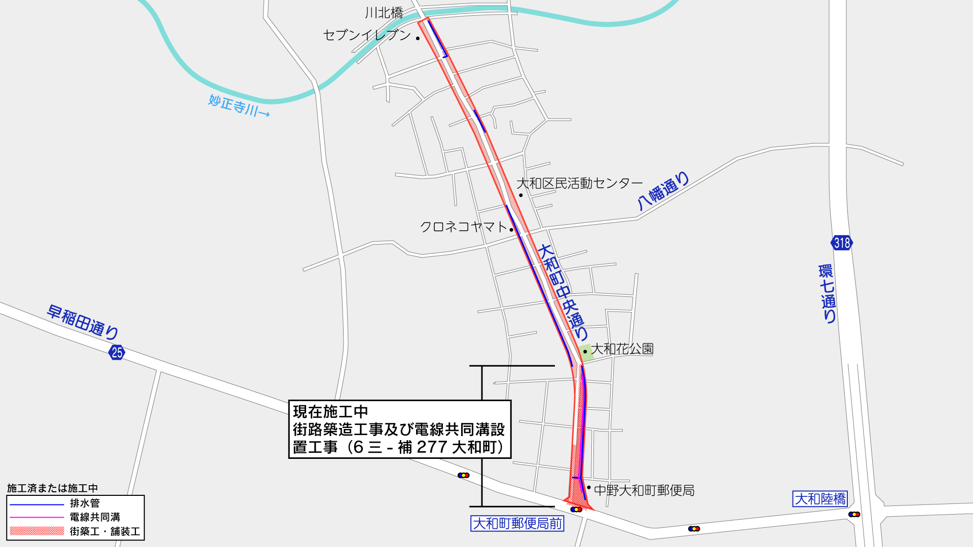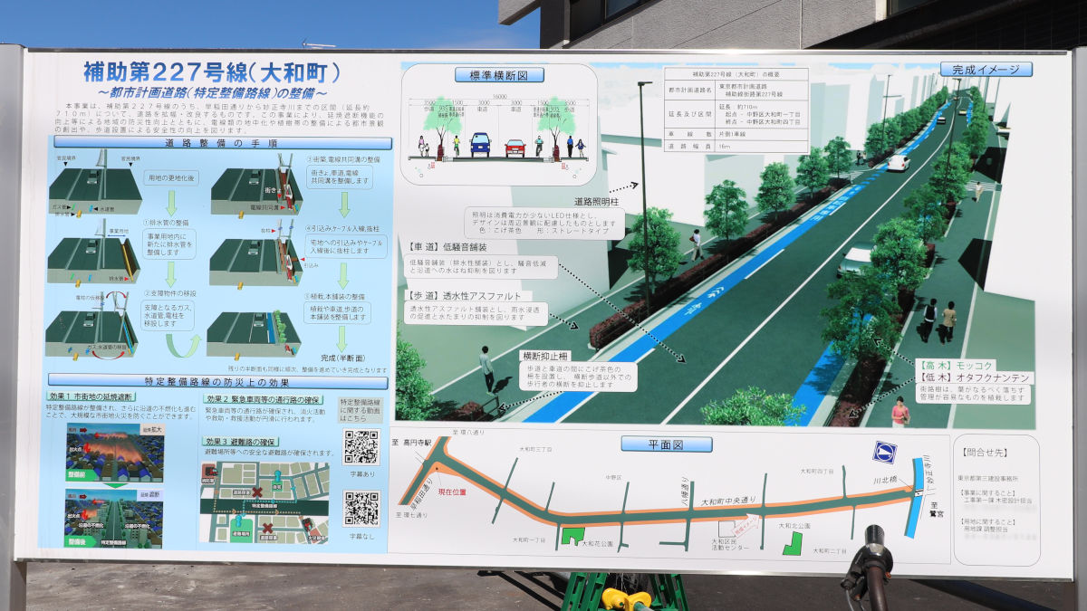 補助第227号線杉並区高円寺南二丁目から練馬区中村北一丁目に至る延長約4,490mの都市計画道路です。このうち上記で示した早稲田通りから妙正寺川では、「大和町区間」として道路を拡幅する事業を行っています。
