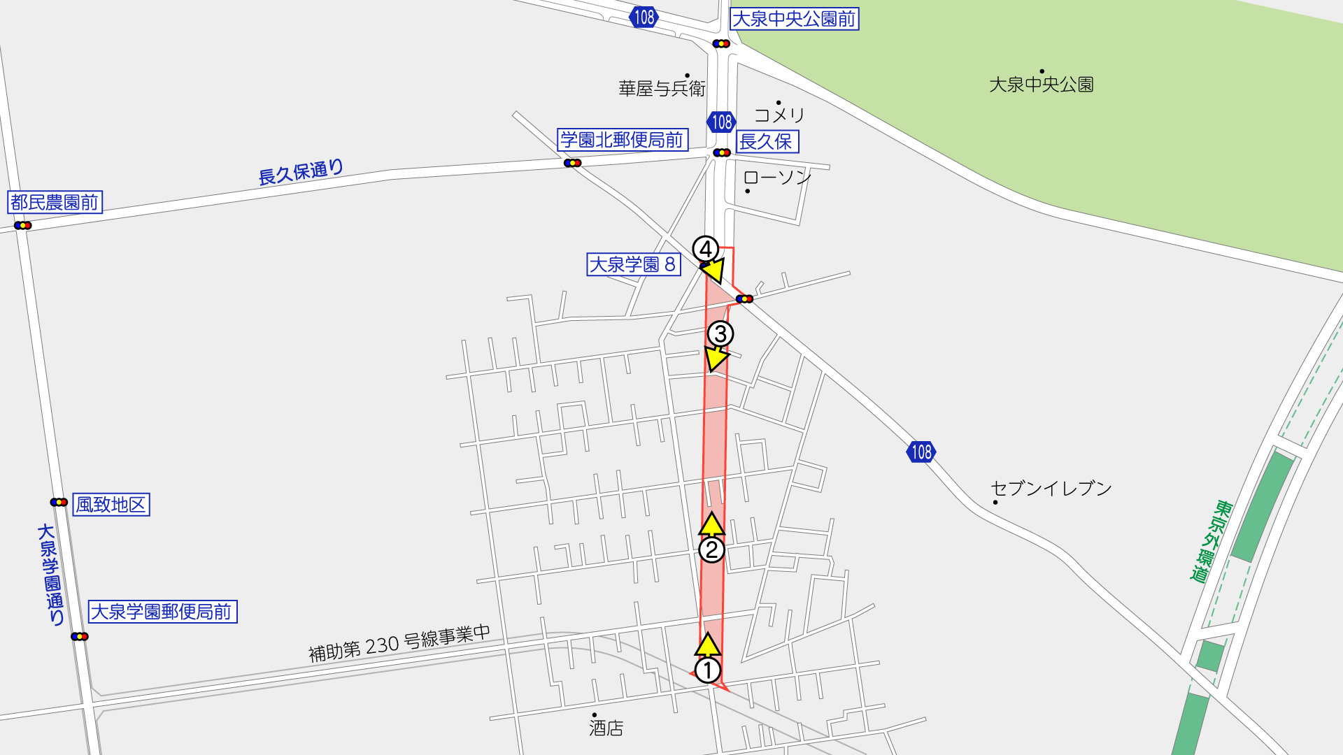 補助第233号線は、練馬区大泉学園町四丁目から練馬区大泉学園町九丁目に至る延長約1,450mの都市計画道路です。このうち、上記図で示した大泉学園町四丁目から大泉学園町八丁目に至る区間では、道路を新設する事業が行われています。