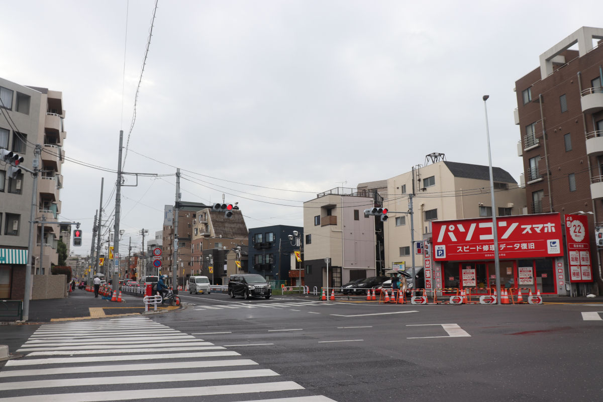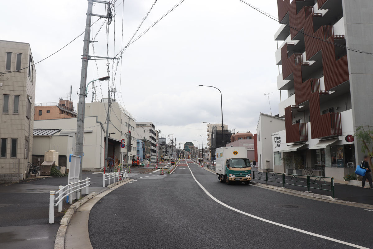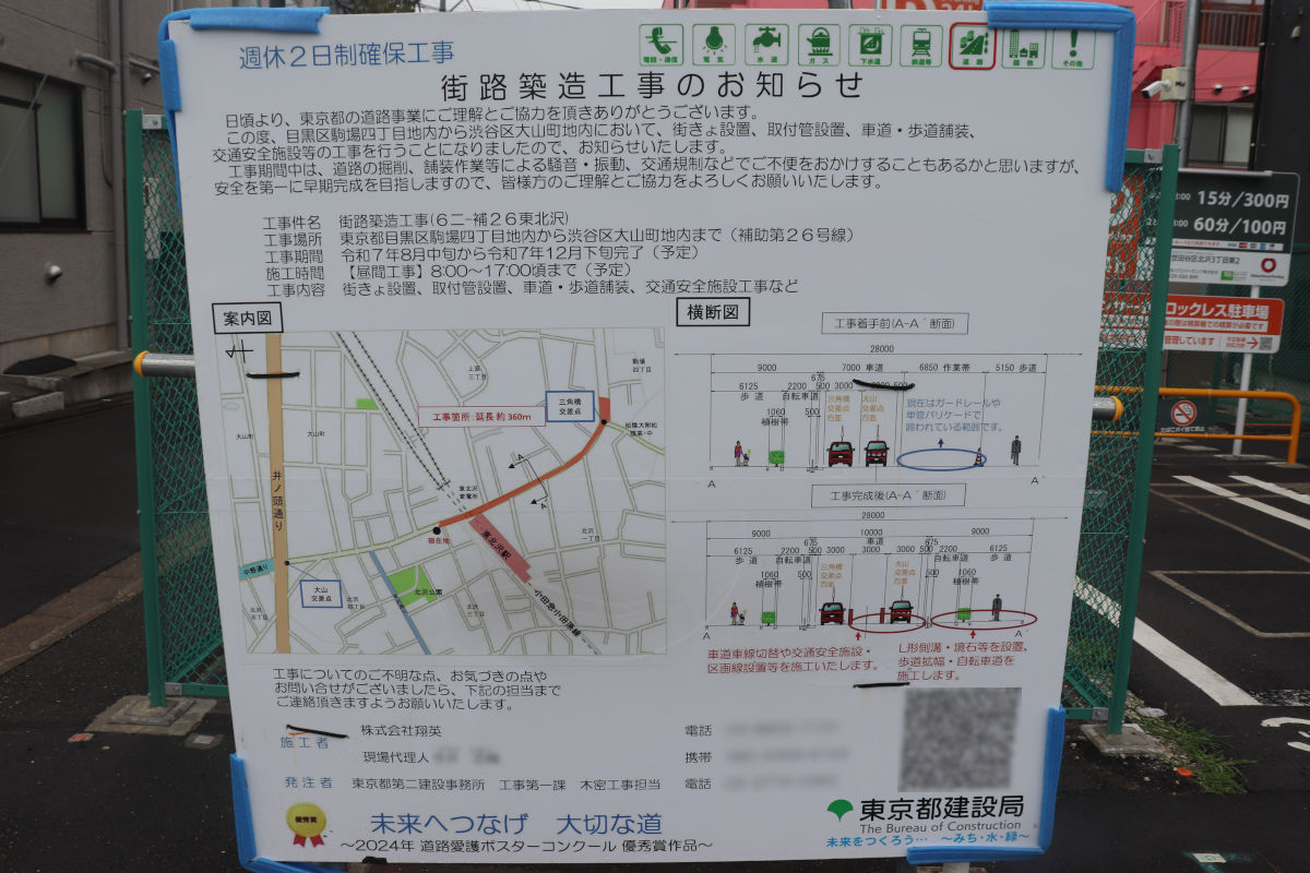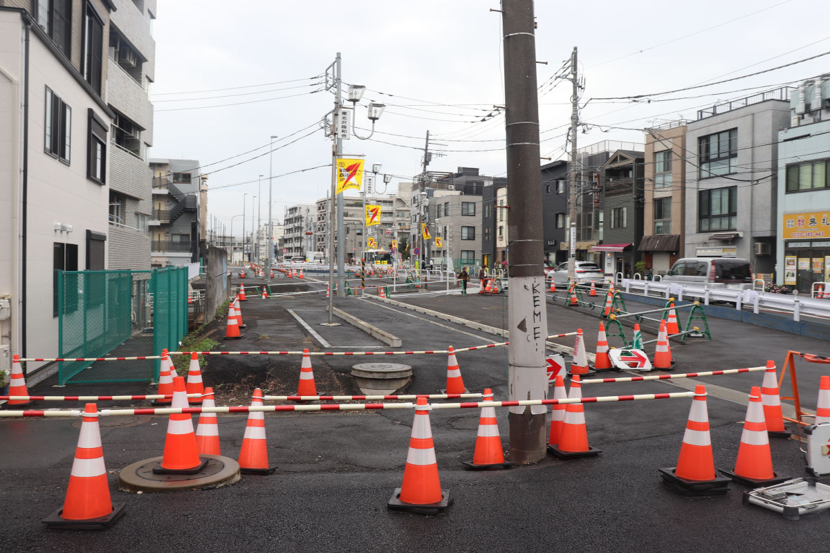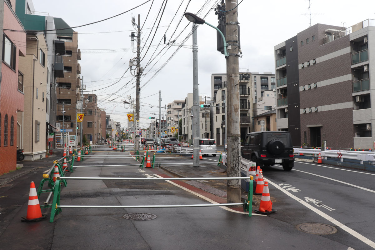 茶沢通りとの交差点付近から北側は、車道を東側に切回し、もともとの道路部分は単管バリケードなどで覆われています。