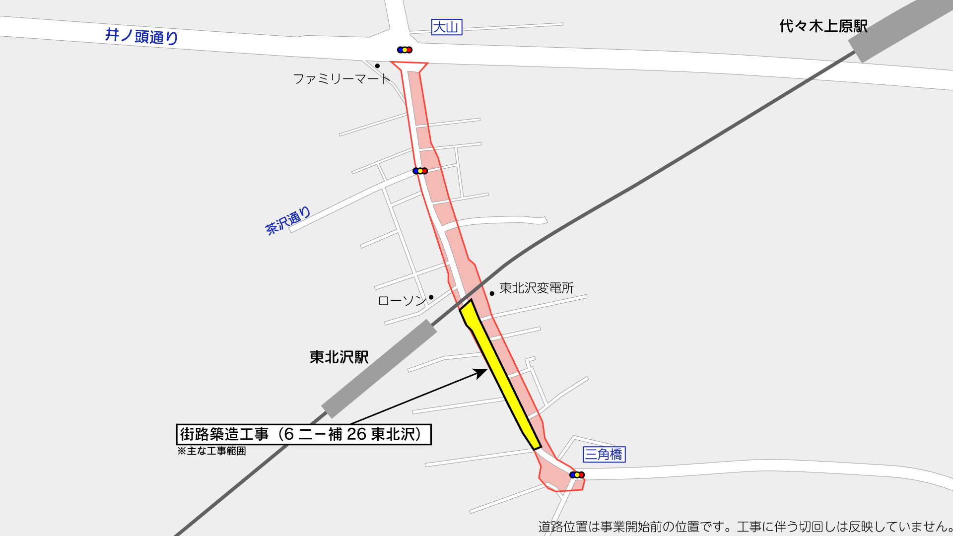 補助第26号線品川区東大井一丁目から板橋区氷川町に至る延長約22,350mの都市計画道路です。このうち上記で示した区間では、「東北沢区間」として道路を拡幅する事業を行っています。