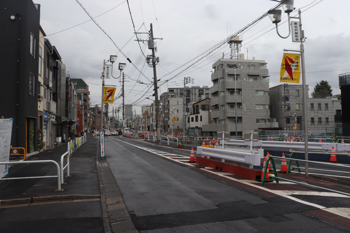 東北沢駅前の交差点から北側は、現在は工事は行われていません。