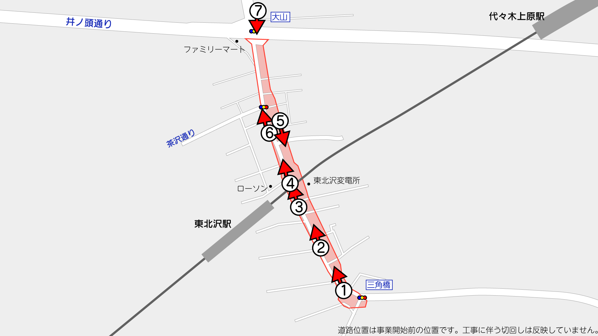 入札情報サービスによると、東北沢駅前の交差点から北側の工事と見られる「街路築造工事及び電線共同溝設置工事(7二ー補26東北沢)」が現在入札中で、10月30日に開札予定です。