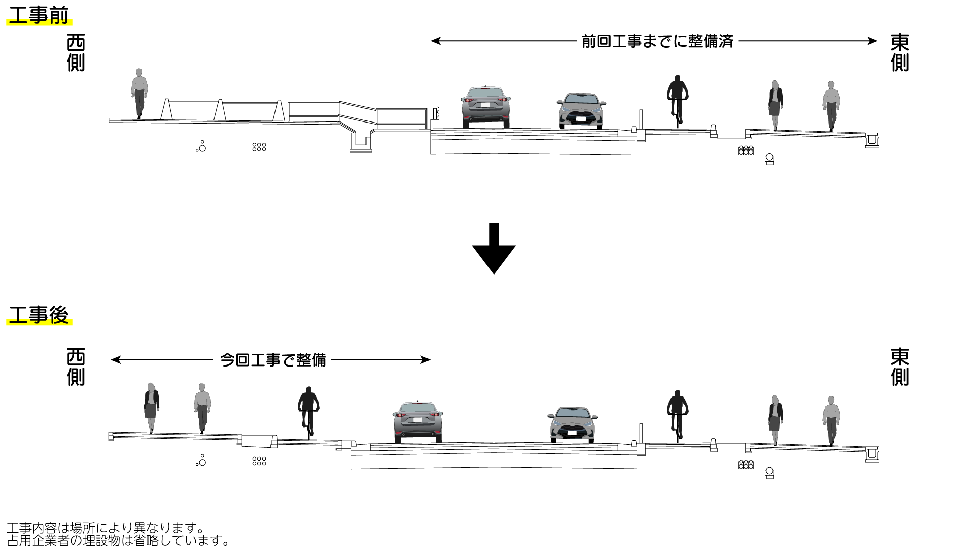 現在は、車道を東側に切回したうえで、もともと道路があった西側断面の工事が進められているところです。