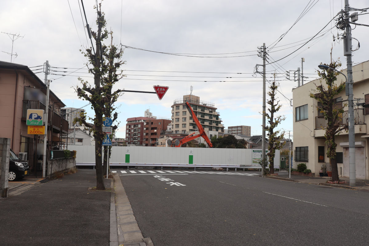 写真正面、仮囲いの先にJR線があり、橋梁下部工事(橋台設置工事)が進められています。