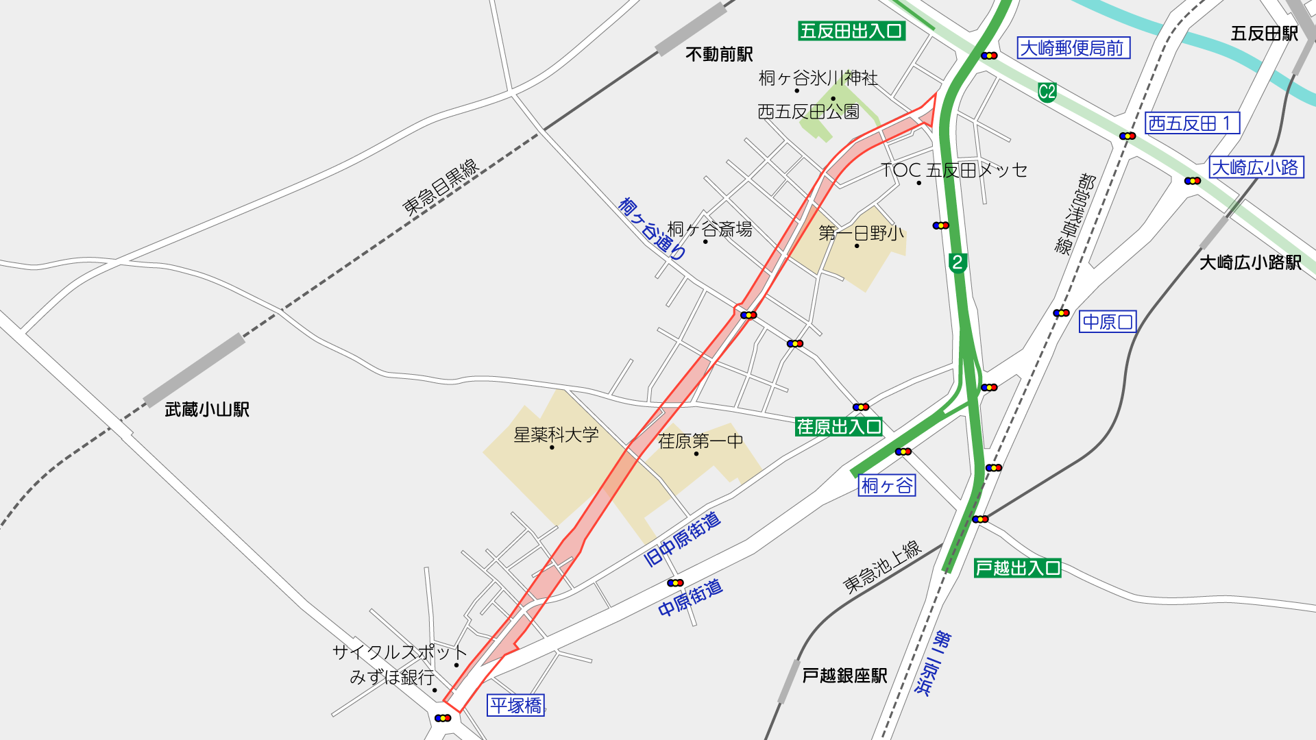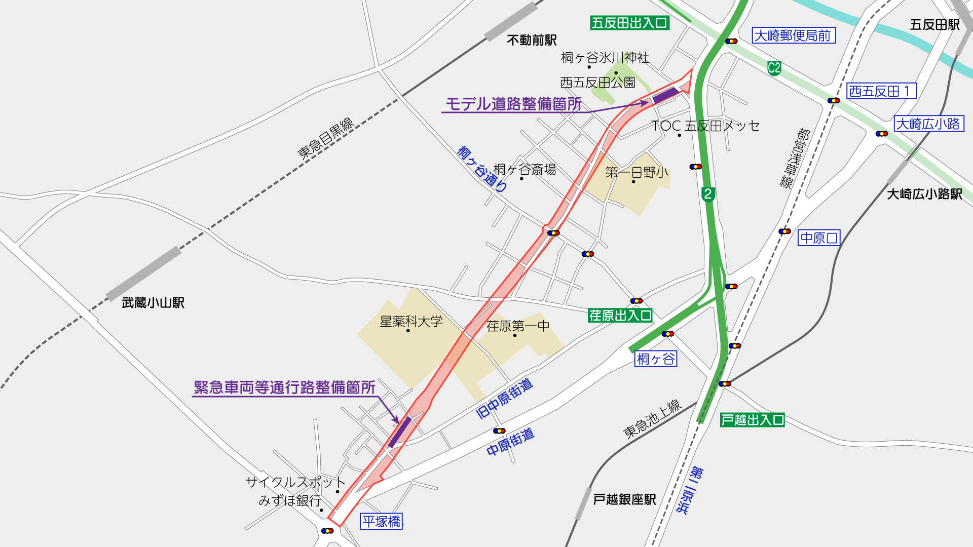 西五反田から平塚橋交差点まで道路を整備するもので、中原街道をバイパスするようなルートで整備される計画です。都市計画的には放射街路の1つなので、こちらが本線というような扱いですが、整備される道路は2車線(片側1車線)で、取り付く交差点形態からも実際には本線にはならないんじゃないかなと思われます。