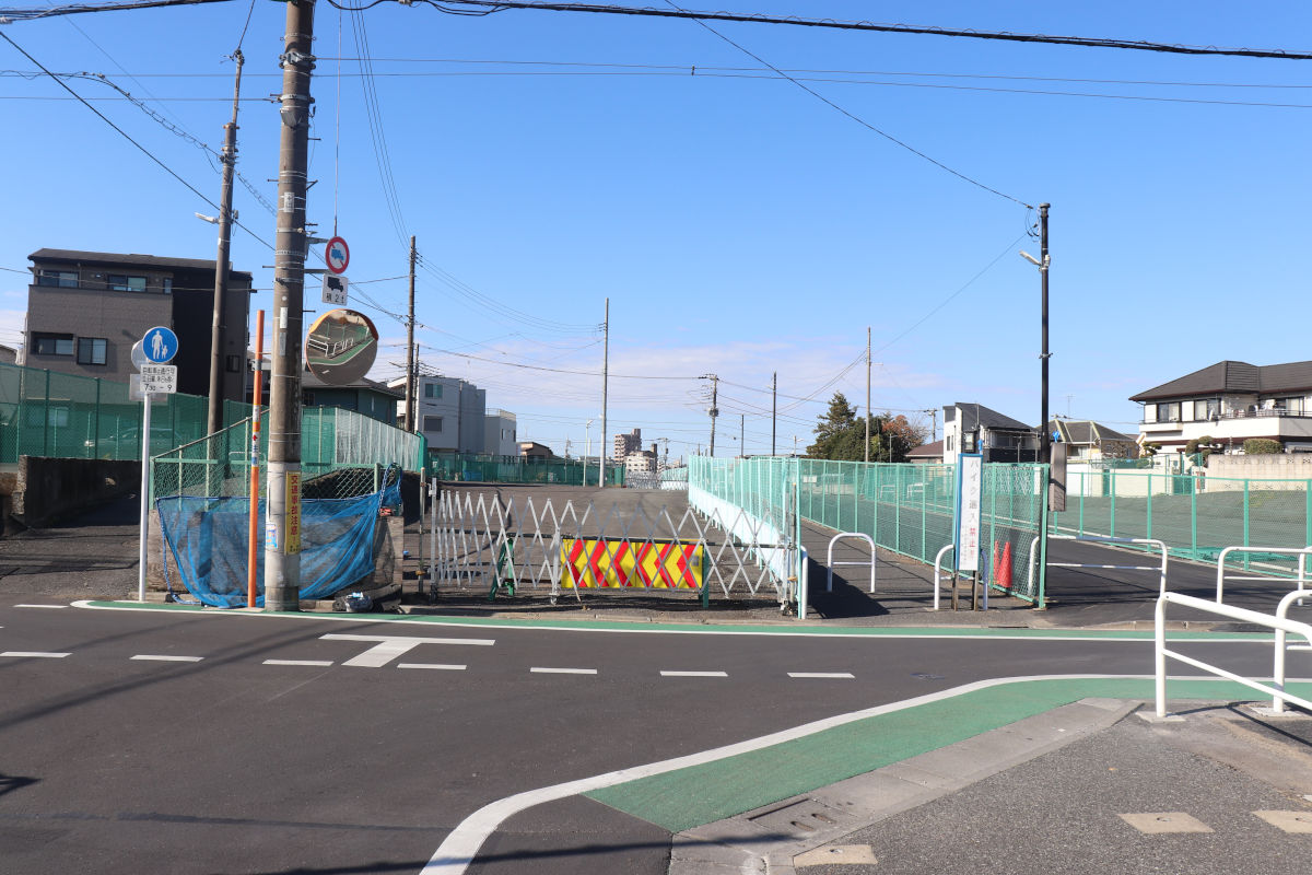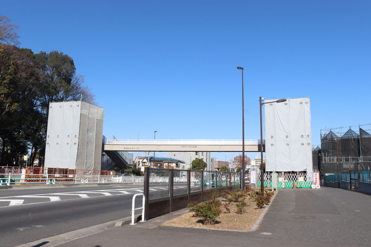 2020年3月30日15時に交通開放された環八通り~川越街道間は、その後大きな変化はありませんが、北町西小学校北交差点の北側で横断歩道橋の整備工事が進められています。