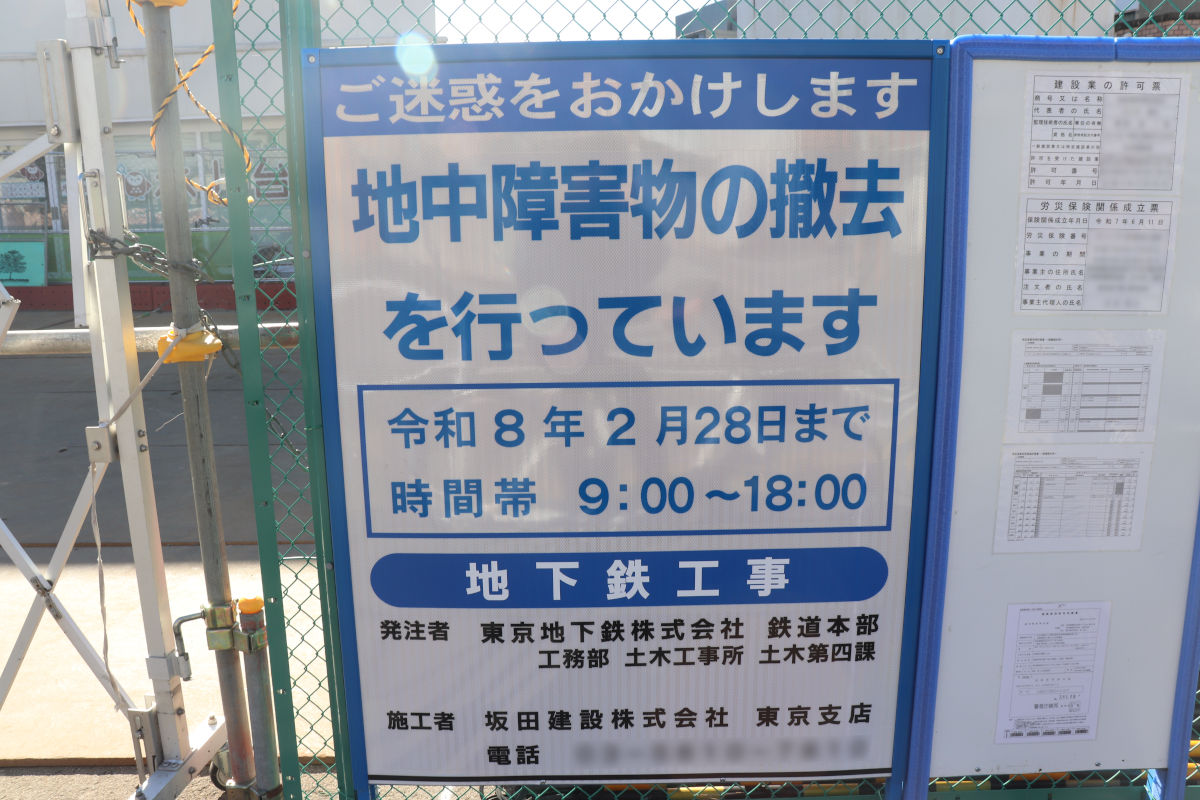 左側、かつては駐輪場があり、東京メトロ有楽町線・副都心線の氷川台駅の直上部分の土地では、東京メトロ発注の地中障害物の撤去工事が進められています。