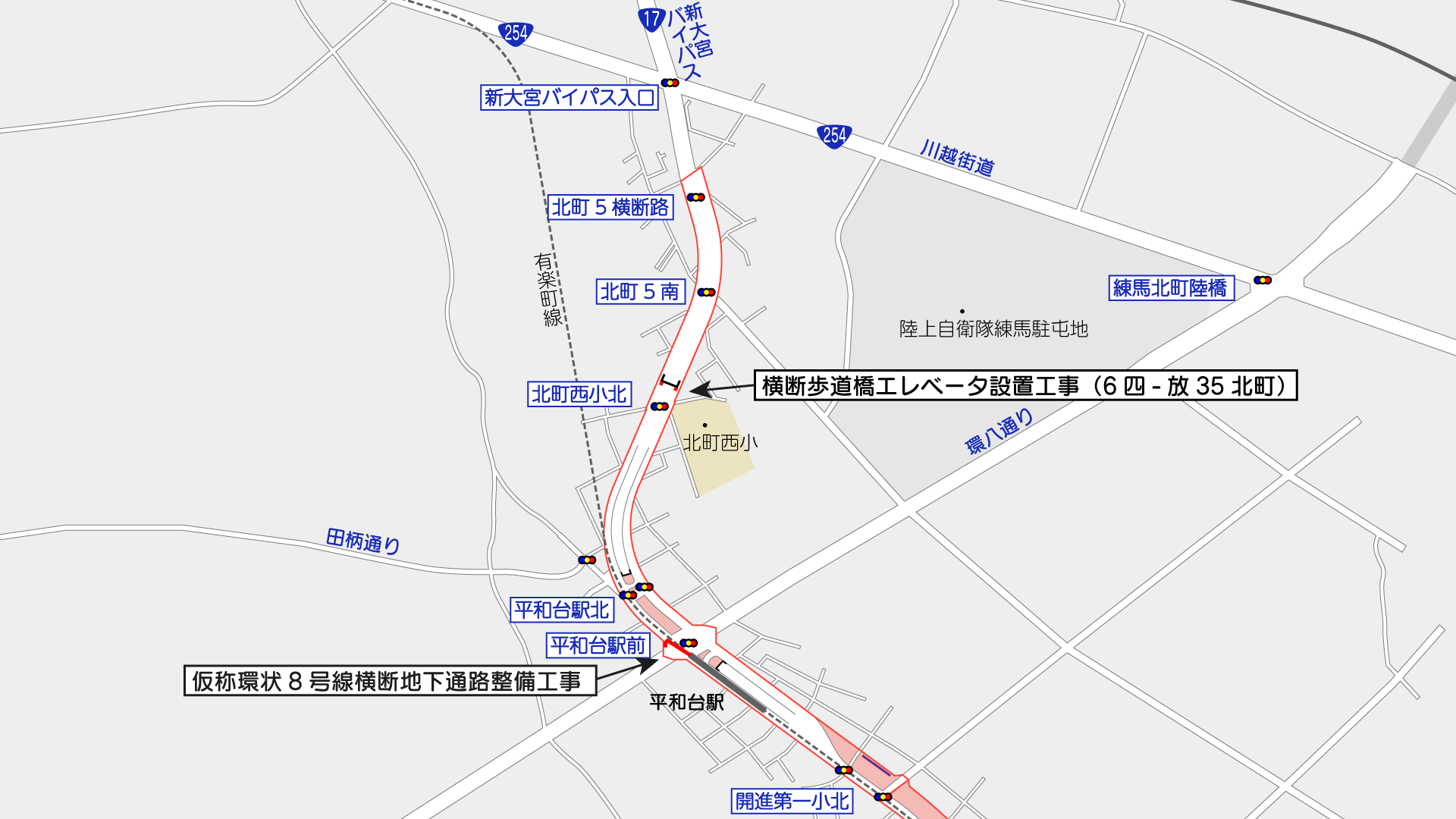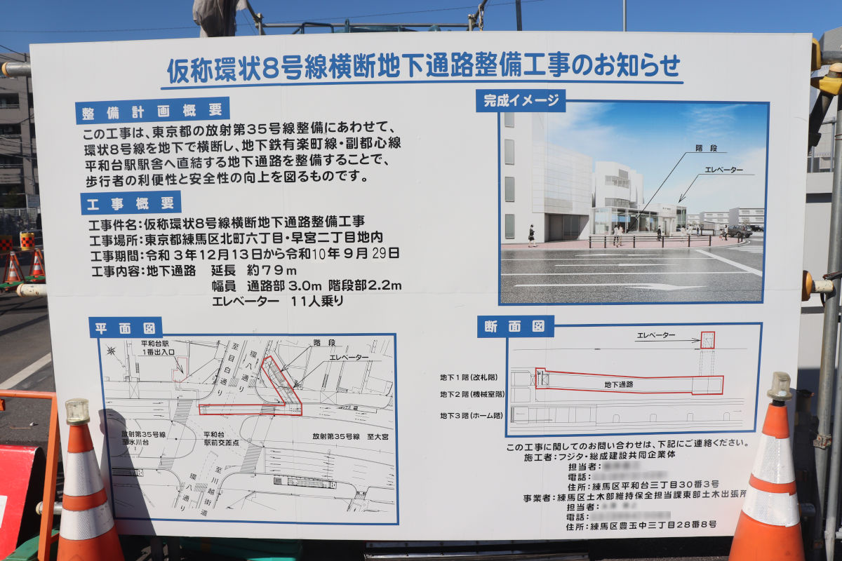 環八通りと交差する平和台駅前交差点では、練馬区発注の工事として、横断地下通路の整備工事が進められています。東京メトロ平和台駅のラチ外通路と接続し、環八通りをくぐってアパマンショップ前に出入口を設ける計画です。