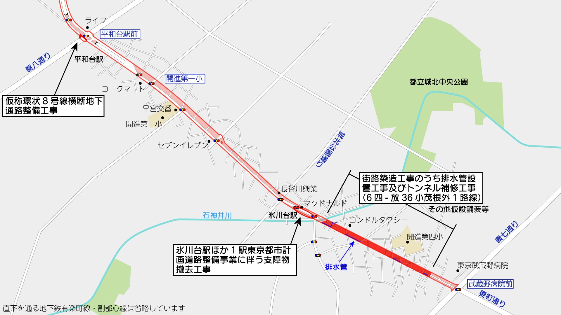環七通り~氷川台駅間で排水管等の設置工事が行われていたほか、氷川台駅周辺で東京メトロ施工の工事が行われています。