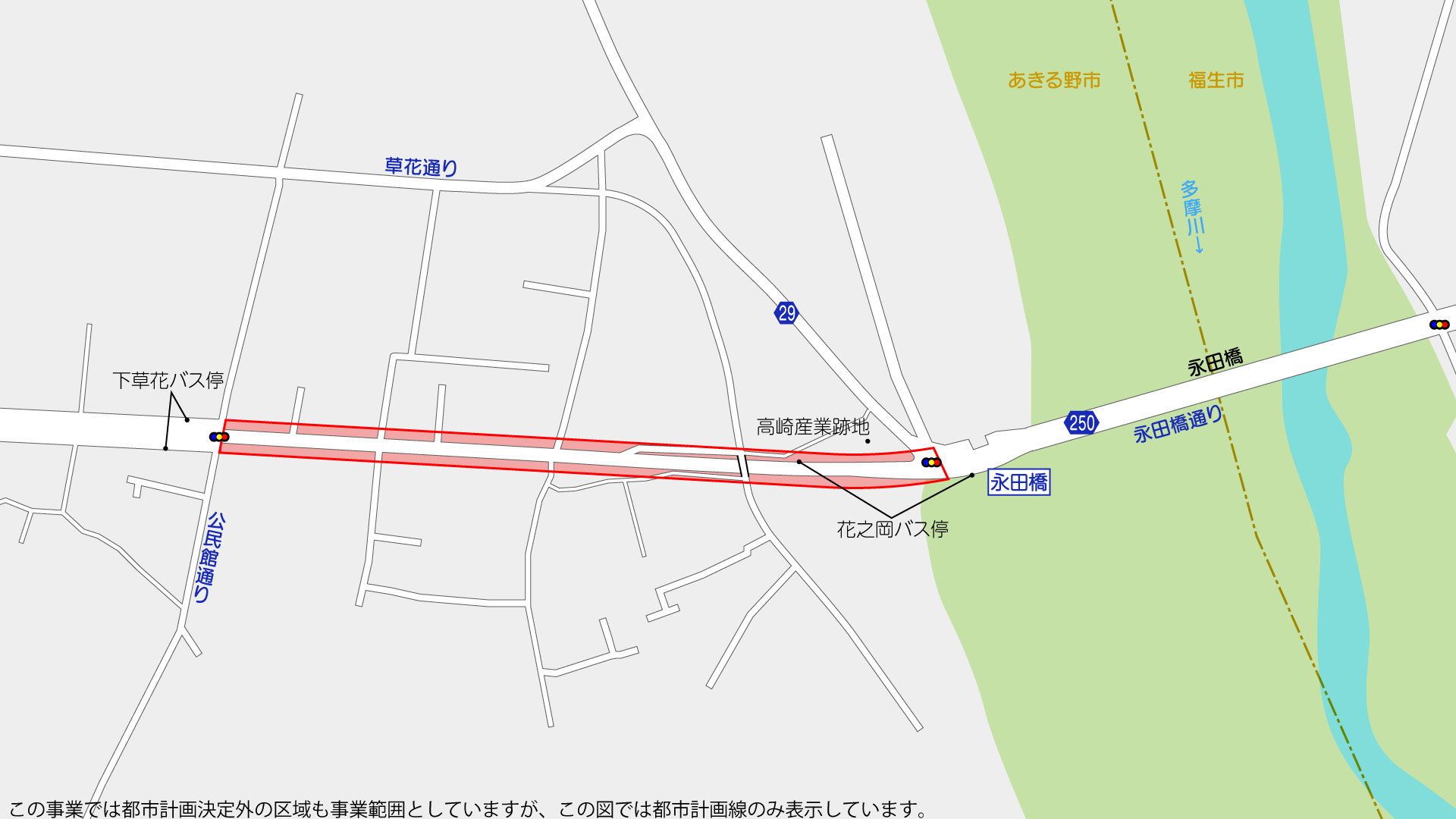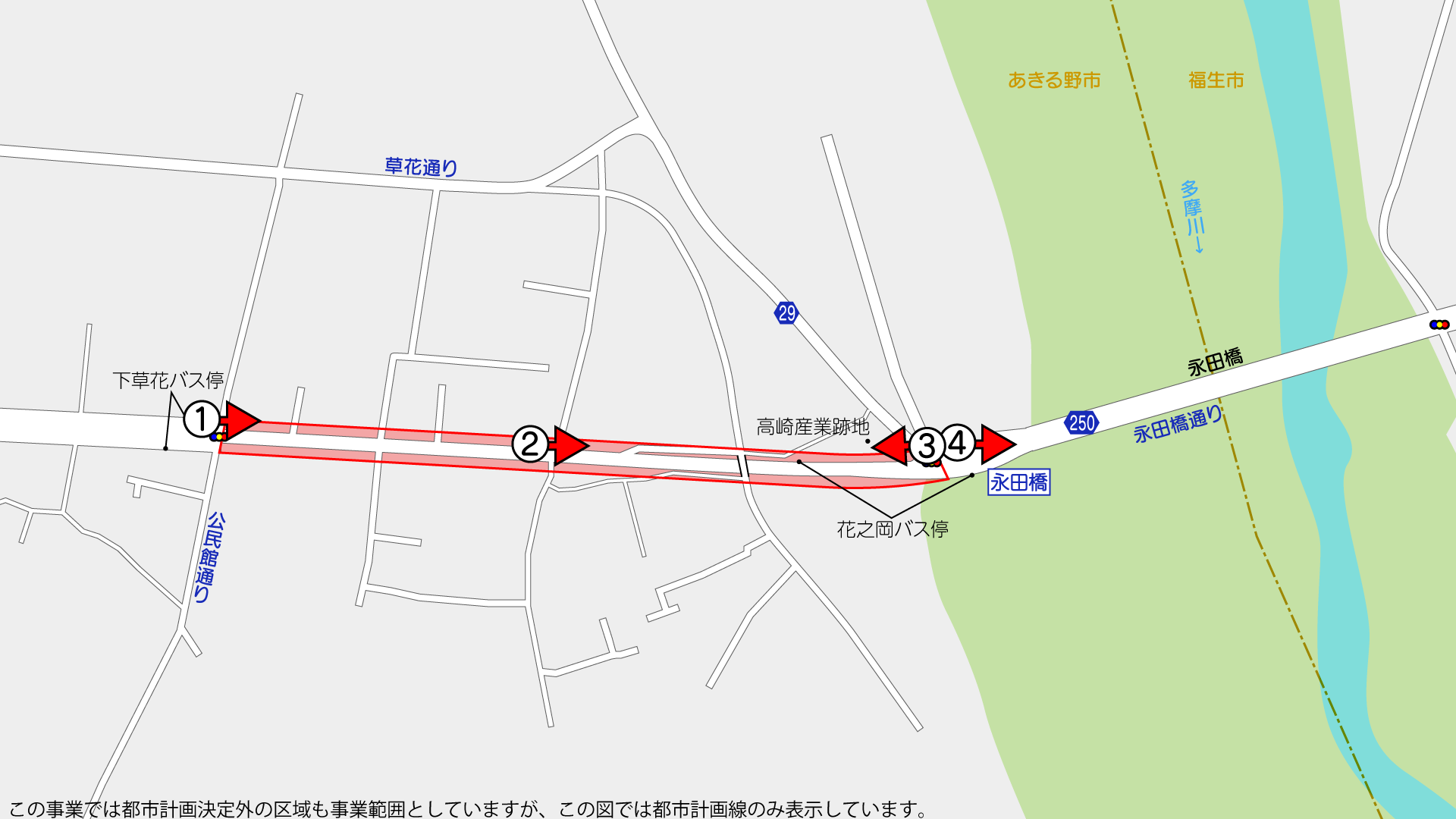 この西側は秋多3・4・6号福生狩宿線(第4工区)が事業中で、氷沢橋交差点付近を除き拡幅が完了しています。