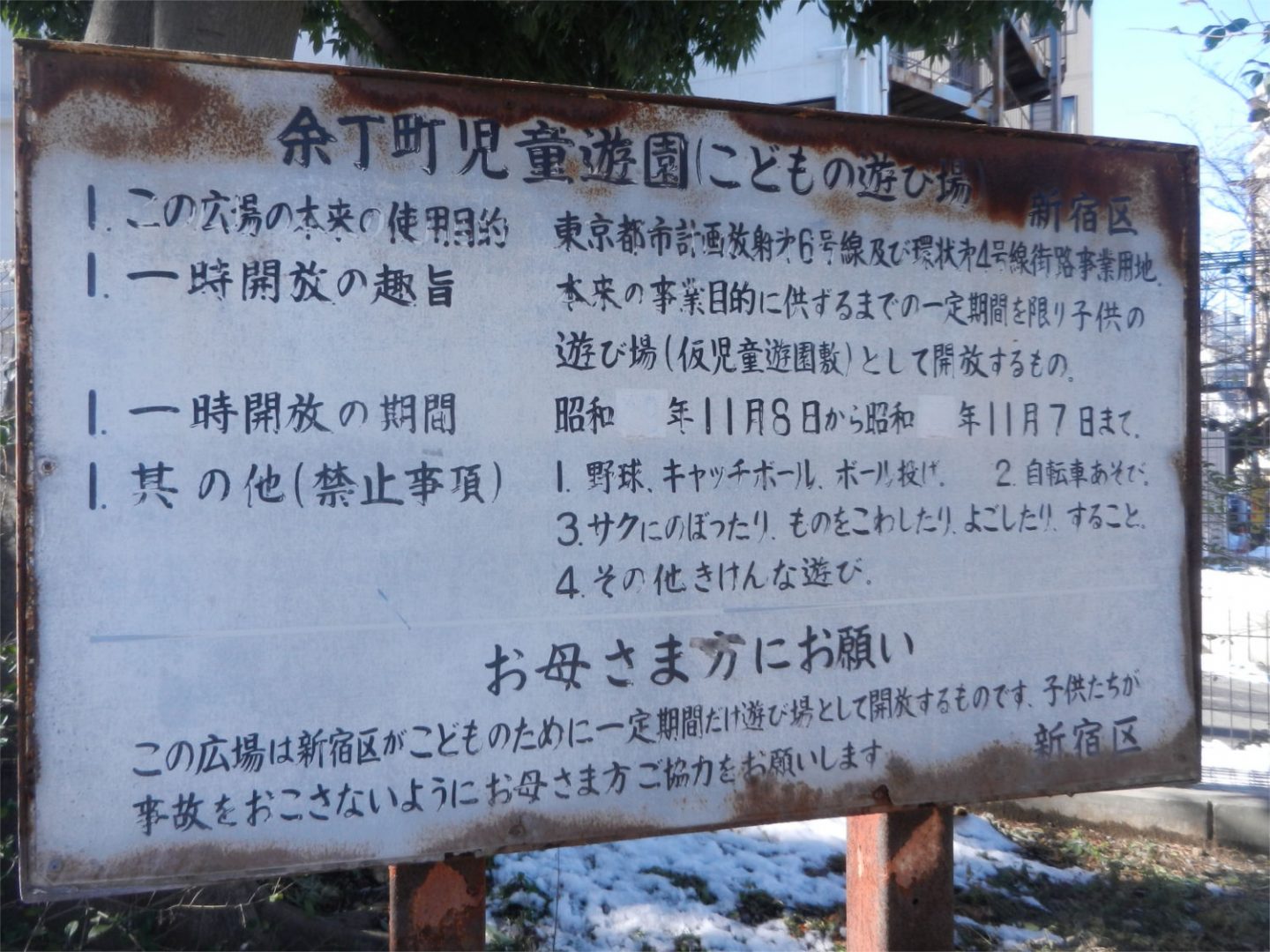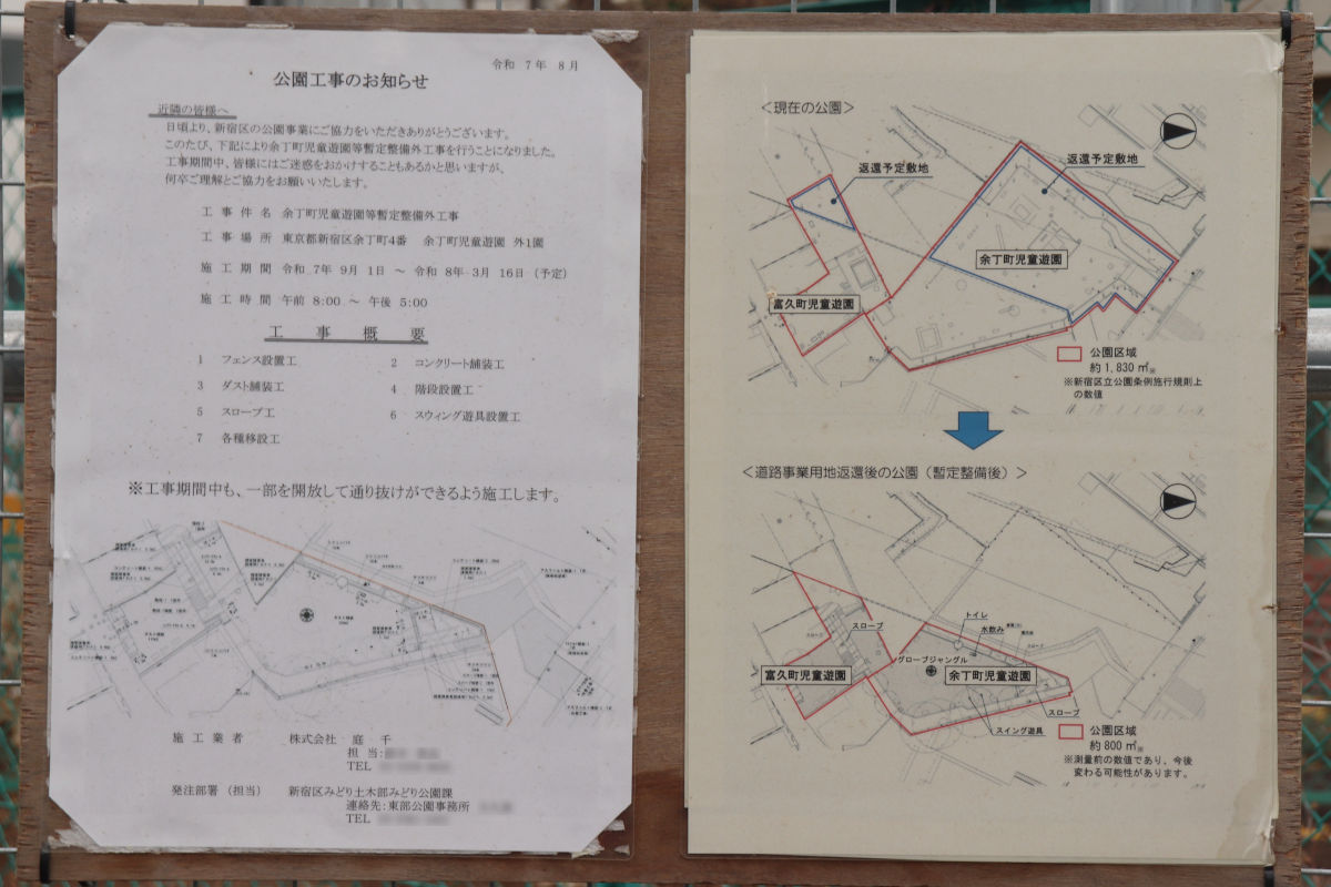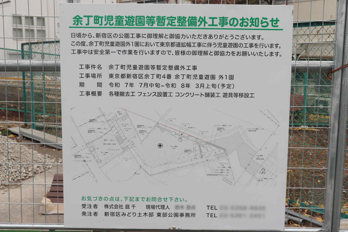 その余丁町児童遊園(富久町児童遊園を含む)ですが、現在、新宿区発注で再整備工事が行われています。都市計画道路予定地に開設されていた広場を廃止し、規模を縮小する形で再整備するもののようです。