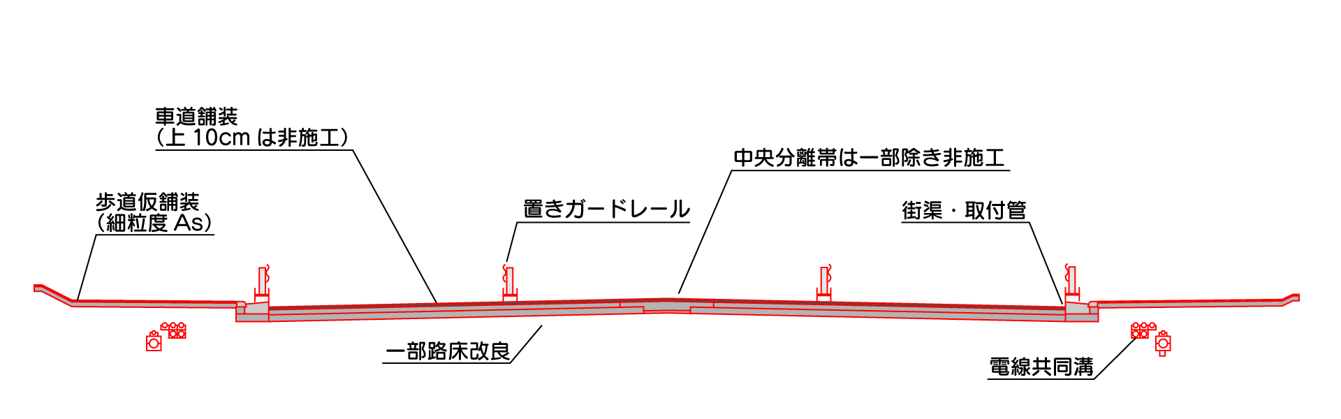 | 工事概要 | 街築工 舗装工 交通安全施設工(照明灯) 電線共同溝設置工 他 |