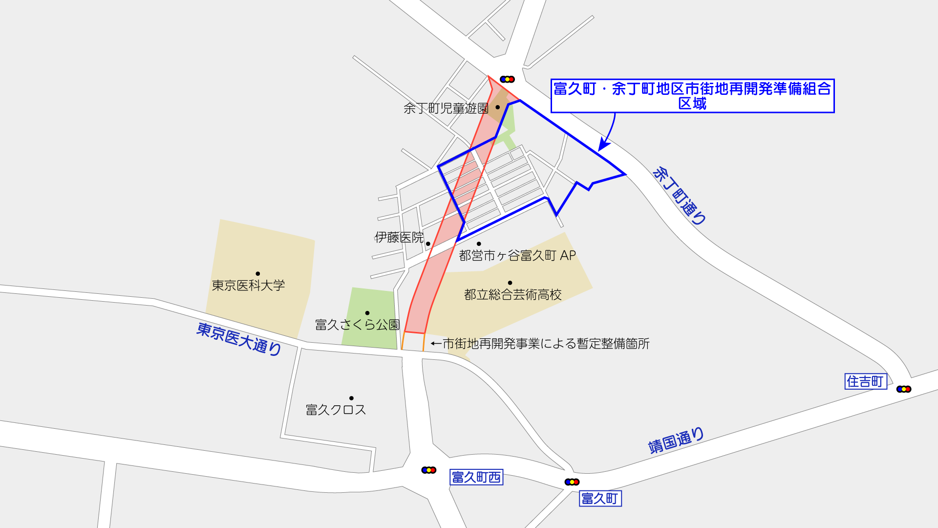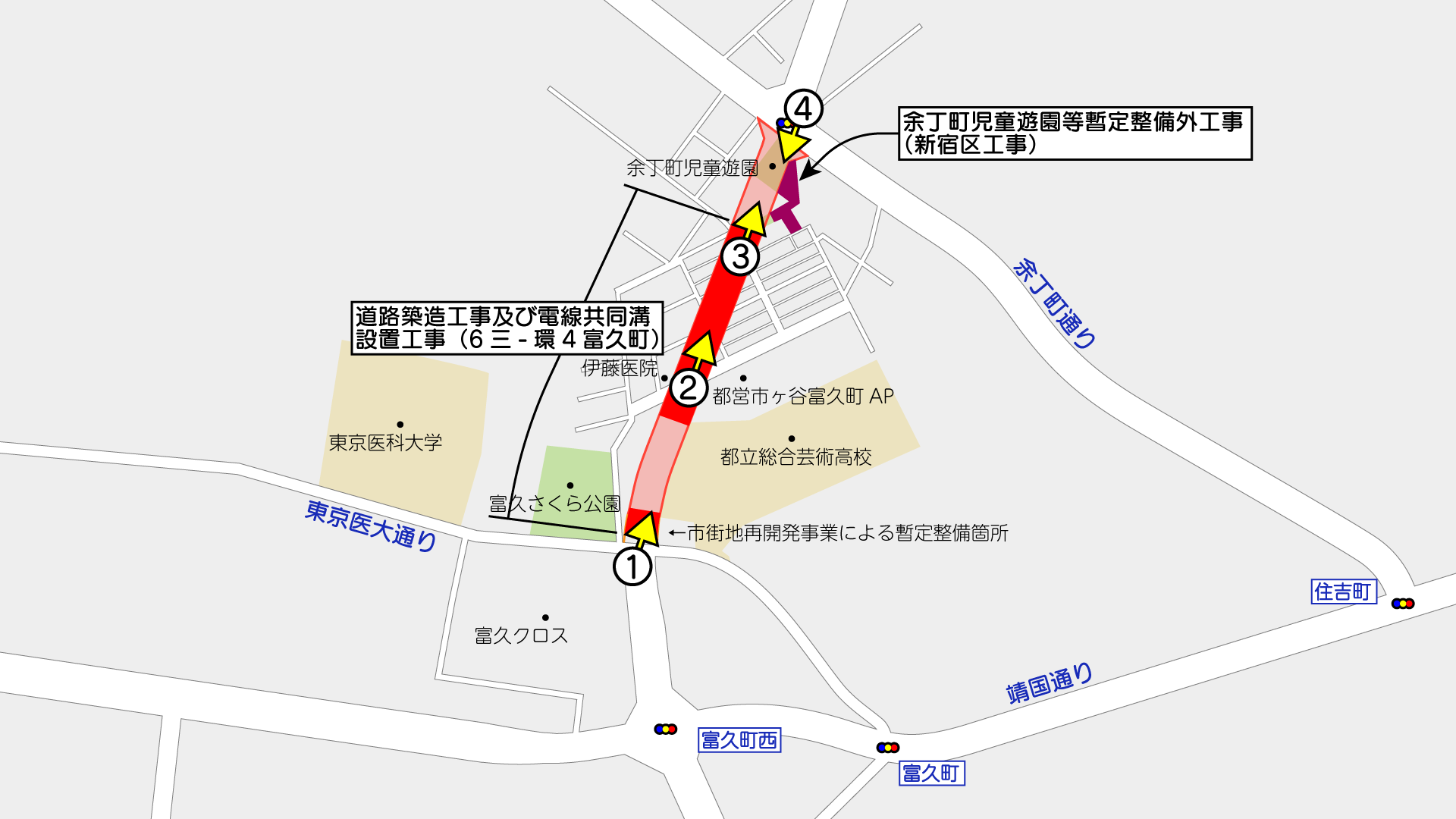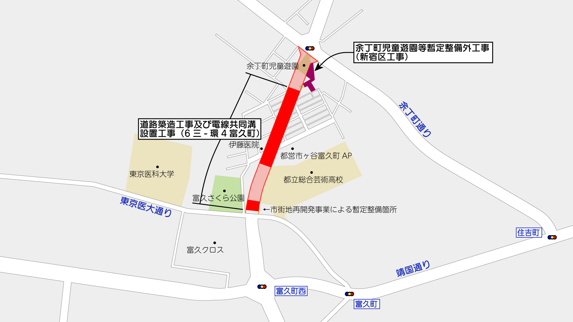 このうち、上記の図で示す区間では「富久町」として事業が行われています。施行者は東京都で、事業認可は2011年2月14日です。事業延長は約330m、幅員27mで4車線となる計画です。